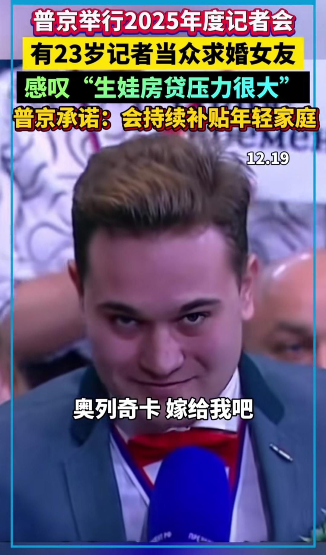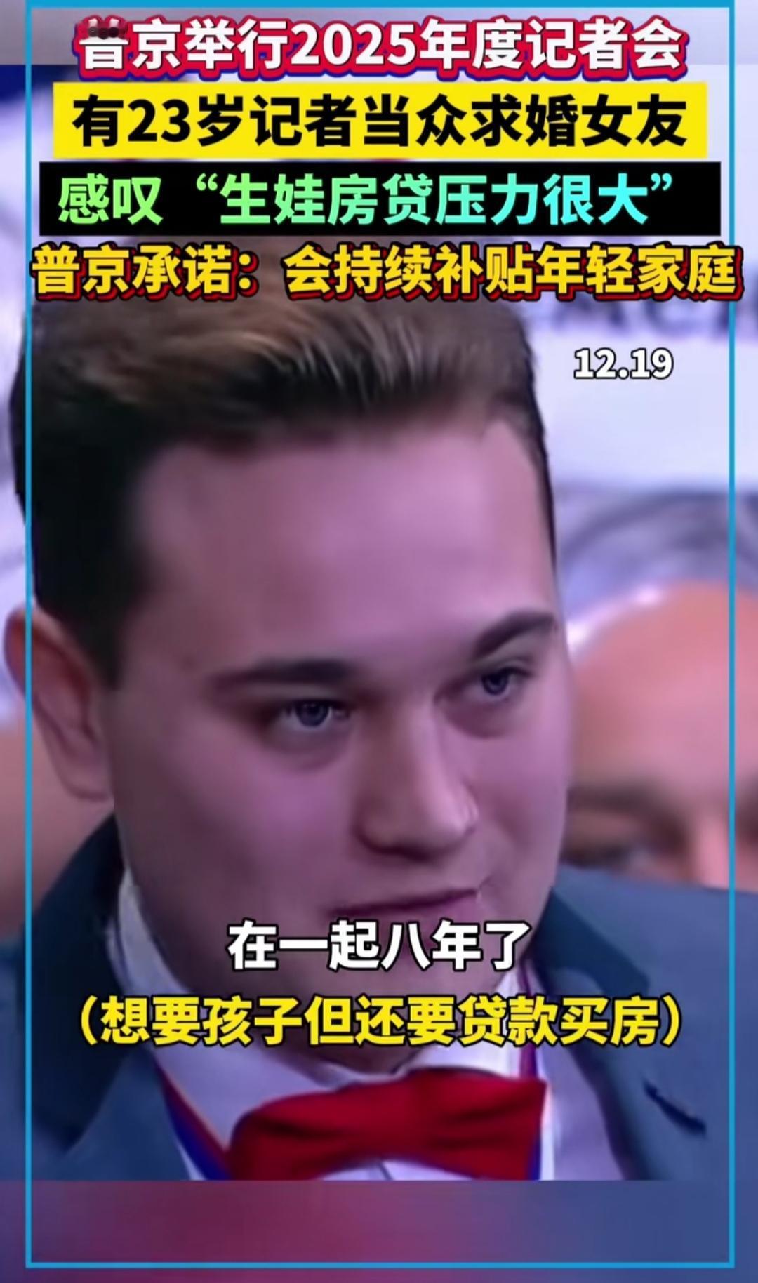 普京2025年度记者会的现场,本以为会是严肃的政策问答,谁也没想到被一位23岁记者的举动戳中了心。他拿着话筒没先提问题,反而对着镜头喊出女友的名字求婚,一句“奥列奇卡,嫁给我吧”,让严肃的会场多了丝浪漫,可后面的话却让人心头一沉。 他说和女友相恋八年,想生娃却被房贷压得喘不过气,这话何止是他一个人的心声。不管是哪个国家的年轻人,好像都逃不过成家后的现实难题:想给爱人一个家,要面对房贷的压力;想迎接新生命,又要考虑养育的成本。 普京笑着调侃他15岁就恋爱,转头却承诺会持续补贴年轻家庭。这一幕浪漫又扎心,浪漫的是年少情深的奔赴,扎心的是现实压力的桎梏。说到底,每个年轻人对家庭的憧憬,终究都需要一份能托住生活的底气啊。
