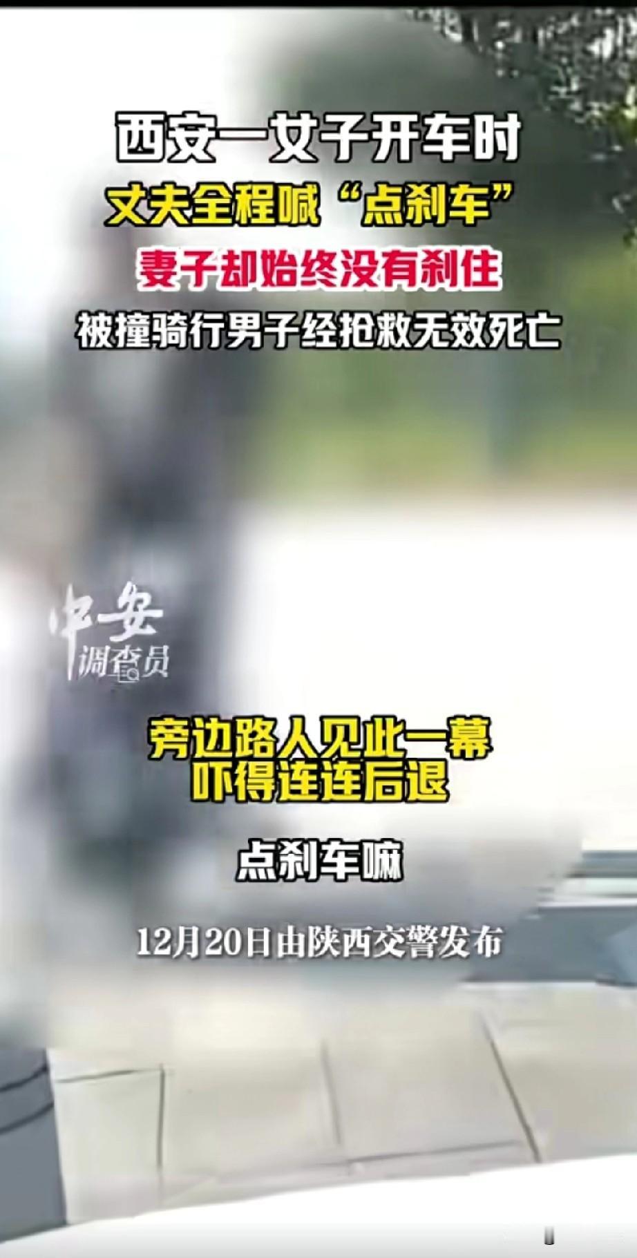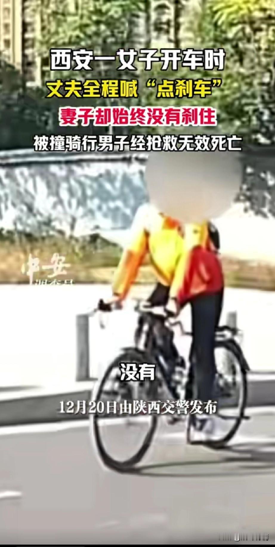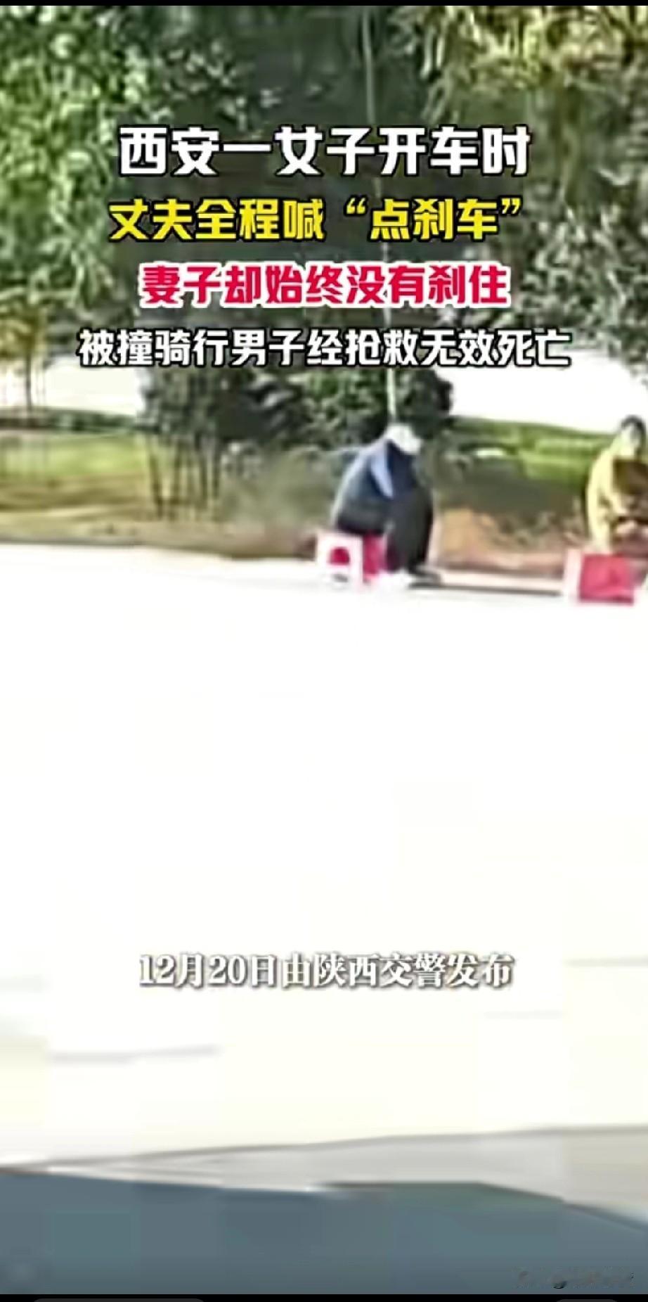 近日西安生的这起交通事故真的太抽象了,以前总是看段子女司机, 如今却是真实案例, 女子开车丈夫坐在副驾驶, 由于妻子是新手刚拿了驾照, 想要锻炼锻炼自己的驾驶技术, 于是老公就坐在副驾驶上, 在经过一处路口, 一名穿着橙色衣服的骑手, 从路边骑了过来, 我听到老公喊妻子刹车, 快点刹,点刹! 妻子就是不刹车, 车辆在没有减速的情况下, 将骑自行车的男子撞倒, 男子经抢救无效死亡, 路口还坐着两个大爷, 他们亲眼目睹了这一起交通事故, 事后妻子和老公赶紧下车查看, 并且还报了警, 交警赶到现场后, 认定了事故的全场责任, 这就是一起典型的女司机事故, 这回不仅要赔钱甚至还要坐牢, 这就是新手女司机的危害! 大家对于这起西安新手女司机撞人事件怎么看? 西安爆料 女司机 交通事故责任 驾驶事故