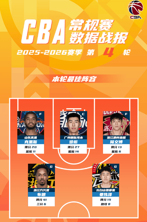 2025-2026赛季CBA联赛常规赛第4轮结束较量,来自山东男篮的克里斯,广州男篮的徐昕,浙江男篮的陆文博,广厦男篮的布朗和吉林男篮的姜伟泽入选CBA联赛常规赛第4轮最佳阵容!