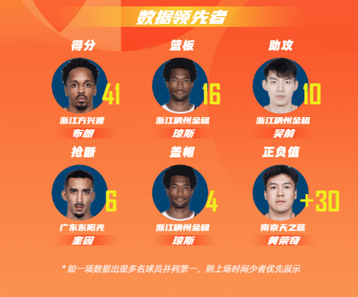 广厦男篮球员布朗以单场41分的数据领衔得分榜;