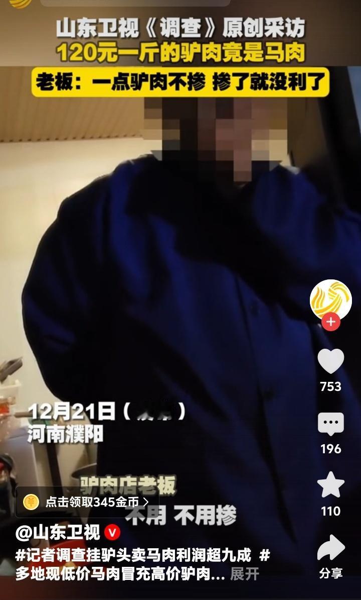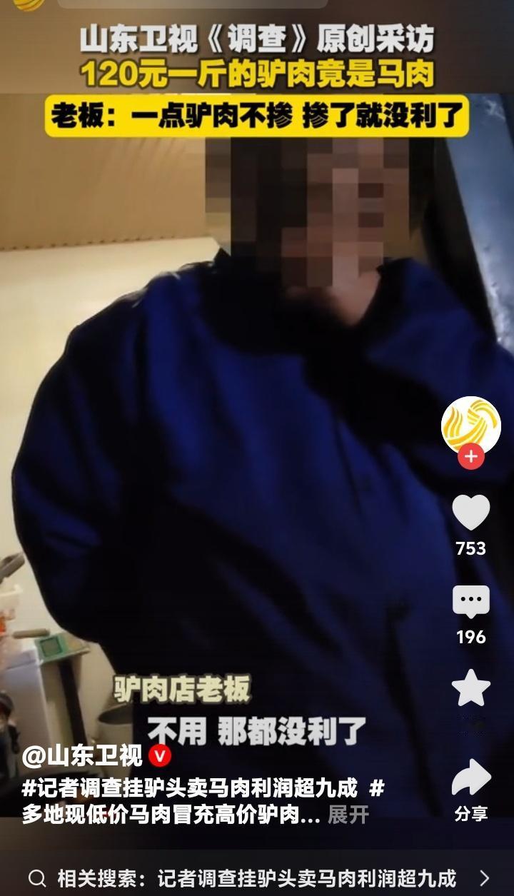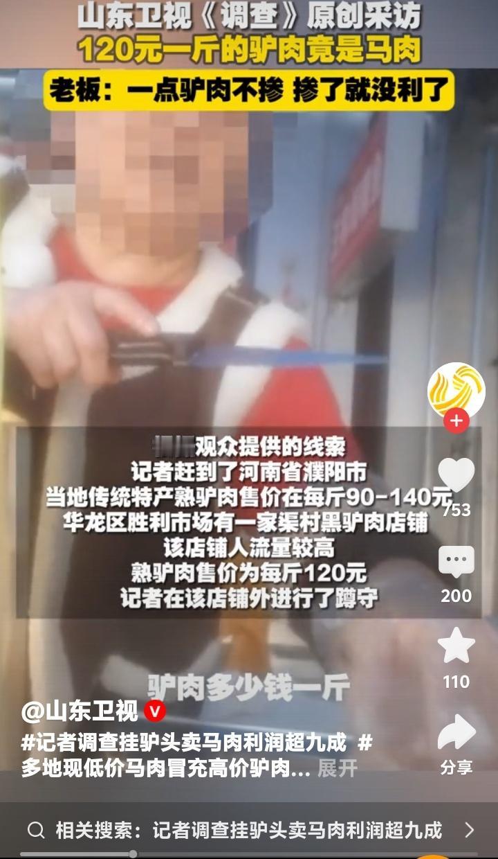 惊天骗局!河南濮阳120元一斤“黑驴肉”竟全是马肉,老板嚣张坦言:一点驴不掺,掺了就没暴利! 当你在熟食店窗口前,指着那块酱香浓郁、纹理分明的“驴肉”,爽快付出一百二十元高价时,你可曾想过,自己满心期待的滋补美味,可能只是一场精心策划的骗局?近日,山东卫视《调查》记者深入河南濮阳,揭开了“挂驴头卖马肉”的黑色产业链,触目惊心的真相,拷问着每一个消费者的信任。 在濮阳市华龙区胜利市场,一家名为“渠村黑驴肉”的店铺生意红火,每斤熟肉标价高达120元,与市价无异。络绎不绝的顾客,冲着“传统特产”的名头而来,殊不知,他们虔诚购买的,从根源上就与“驴”字毫无瓜葛。这并非疏忽,而是一场彻头彻尾的、冷静计算后的欺诈。 记者的镜头跟随店铺老板,揭开了原料的源头。老板轻车熟路地前往养殖场,支付的7600多元,换来的却是约240斤马肉、板肠和骨架。折算下来,生马肉成本仅每斤32元左右。巨大的价差,让利润空间赤裸裸地暴露出来。用不足三分之一成本的材料,卖出顶级驴肉的价格,暴利超过百分之两百! 面对隐蔽拍摄的镜头,老板的直言令人脊背发凉:“一点驴肉不掺,掺了就没利了。”这句话,撕下了所有伪装。这不是偶然的以次充好,而是系统性的、毫无顾忌的造假。诚信经营的原则,在惊人的利润面前,被碾得粉碎。消费者的健康与权益,成了他们计算器上最微不足道的数字。 更令人担忧的是,这绝非孤例。调查的深入,描绘出一幅更广阔的区域性乱象图景。从河南到河北,从山东到京津,记者跨越七个主要驴肉消费城市,购买的十二份样品中,竟有七份检测出了马肉成分,检出率高达58%!这意味着,你我在街头巷尾吃到的所谓“驴肉”,有一半以上的概率是冒牌货。 乱象背后,是扭曲的市场逻辑。真驴养殖周期长、成本高,而马肉供应相对充足、价格低廉。在监管的缝隙与暴利的驱使下,一些不良商家便铤而走险,让“驴肉火烧”“酱驴肉”等传统美食蒙尘。有网友甚至无奈调侃:“现在能吃到纯正马肉,都算商家‘良心’了。” 这种欺骗,伤害的远不止是消费者的钱包。它践踏了市场公平的基石,摧毁了人与人之间最基本的信任。当“特产”成为骗局的名片,当“老字号”沦为作假的幌子,我们失去的是一种味道,更是一种对诚信社会的期待。每一次默许,都是对造假行为的纵容。 食品安全,是底线,更是红线。它不应是消费者需要动用侦探智慧去辨别的谜题。整治“挂驴头卖马肉”的乱象,需要监管部门雷霆出击,加强源头追溯与市场抽检,让违法者付出沉重代价;也需要行业自律,建立清晰可追溯的标准;更需要我们每一位消费者擦亮眼睛,勇于监督和举报。 莫让“天上的龙肉,地上的驴肉”这般美味佳话,变成“花钱买教训”的苦涩记忆。守护舌尖上的安全,就是守护我们平凡日子里的那份踏实与幸福。是时候,让每一口肉都吃得明明白白,让诚信的滋味,真正回归到我们的餐桌之上了。 (来源:洵哥根据山东卫视《调查》栏目、山东广播电视台《生活帮》栏目相关报道及网络热议综合整理) 食品安全 消费陷阱
