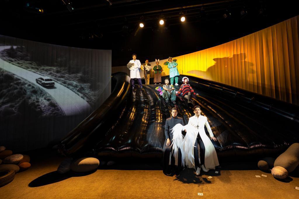 舞台上到处是散落的石块、歪掉的路牌,俨然是一场车祸现场,而占据视野的是高达3米的充气滑梯。导演林丛说,在这样巨型装置的笼罩下,台上发生的一切更增添了一份“纯属虚构”的抽象感和象征意味。(记者白瀛)