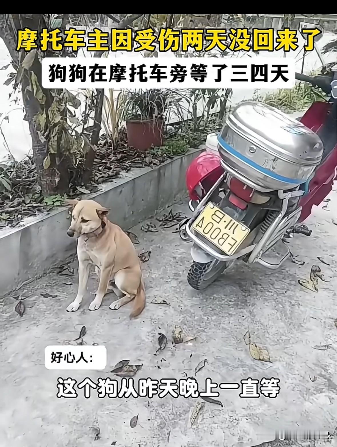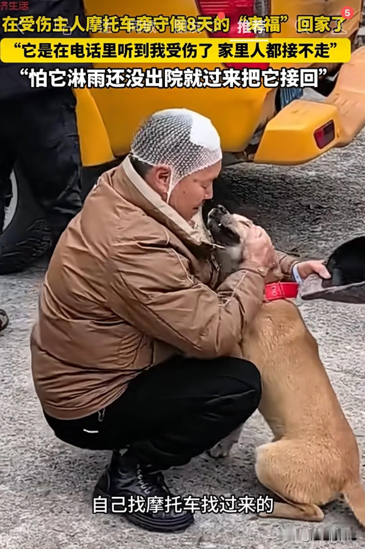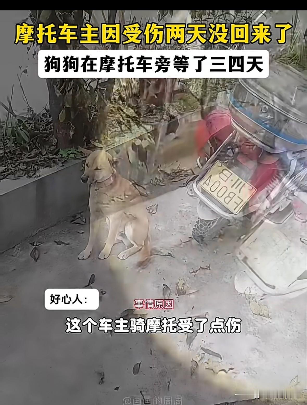 狗主人受伤,狗狗自己跑了很远,找到主人摩托车,不吃不喝不走,白天黑天足足等了8天,期间因为被好心人发现,拍视频发到网上,才被家人看到。去接它也不回家,直到主人过来,它才跟主人回了家。 狗主人说,当时他受伤被送到医院,狗狗是听到他老婆接电话,说他受伤,狗狗就自己从家里跑出来,一路找到摩托车,趴在摩托车边上,等主人。 家人过来接它也不回去,后来主人从医院跑出来,它看到主人亲的不行。狗主人说,这条狗狗叫来福,他养了一年多,平时就他们俩在山上。 有时候真感觉,狗比人更有情义,更忠诚,养条狗,有时候都比交个朋友强。