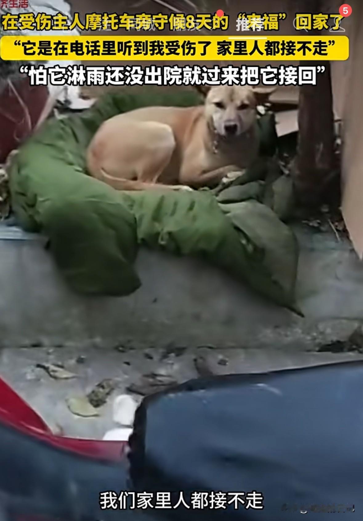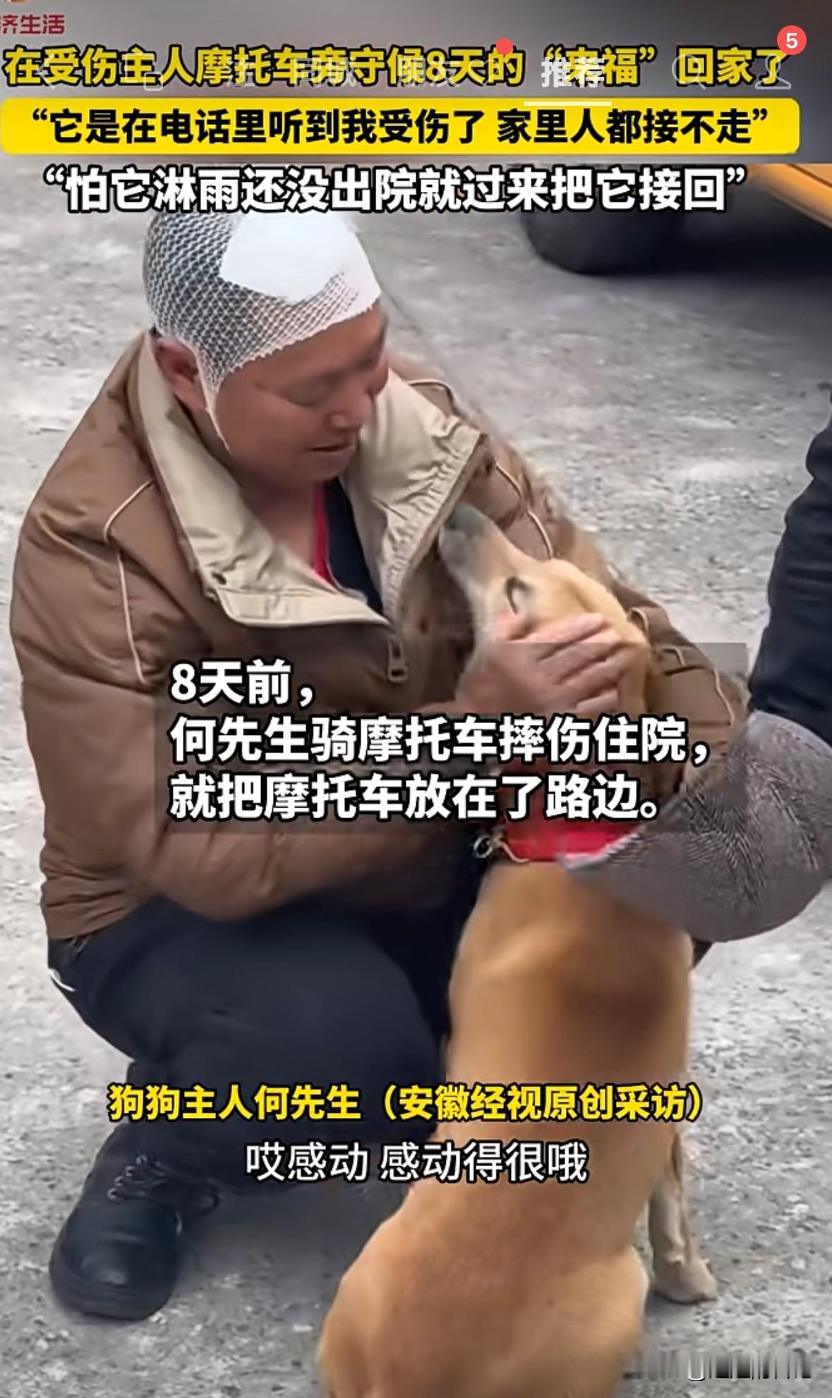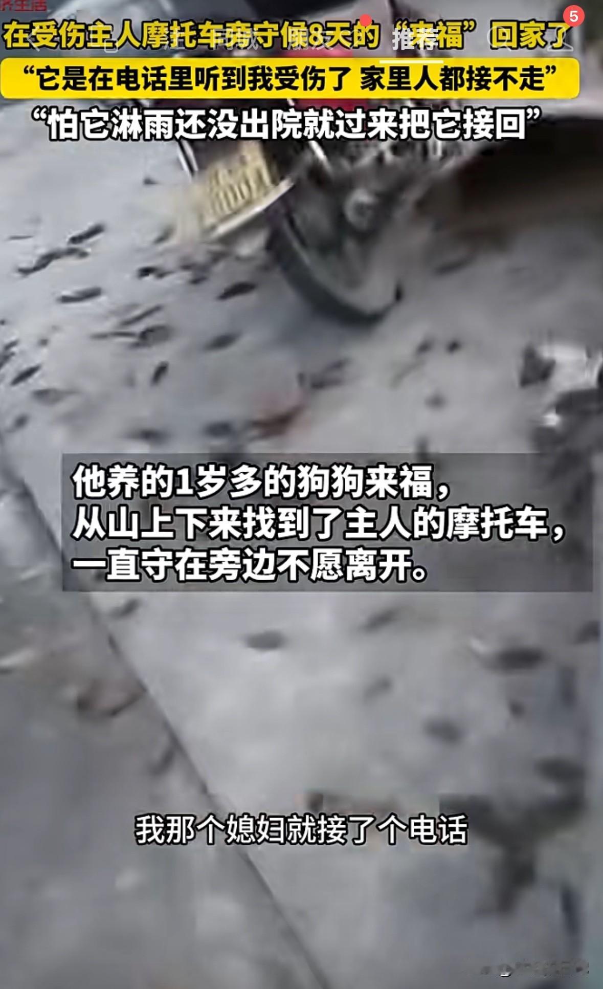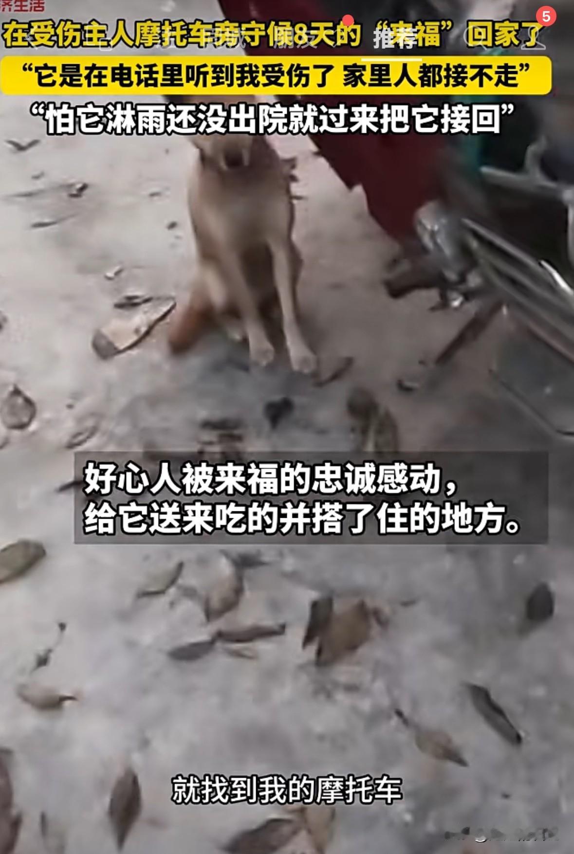 狗主人受伤,狗狗自己跑了很远,找到主人摩托车,不吃不喝不走,白天黑天足足等了8天,期间因为被好心人发现,拍视频发到网上,才被家人看到。去接它也不回家,直到主人过来,它才跟主人回了家。 狗主人说,当时他受伤被送到医院,狗狗是听到他老婆接电话,说他受伤,狗狗就自己从家里跑出来,一路找到摩托车,趴在摩托车边上,等主人。 家人过来接它也不回去,后来主人从医院跑出来,它看到主人亲的不行。狗主人说,这条狗狗叫来福,他养了一年多,平时就他们俩在山上。 有时候真感觉,狗比人更有情义,更忠诚,养条狗,有时候都比交个朋友强。