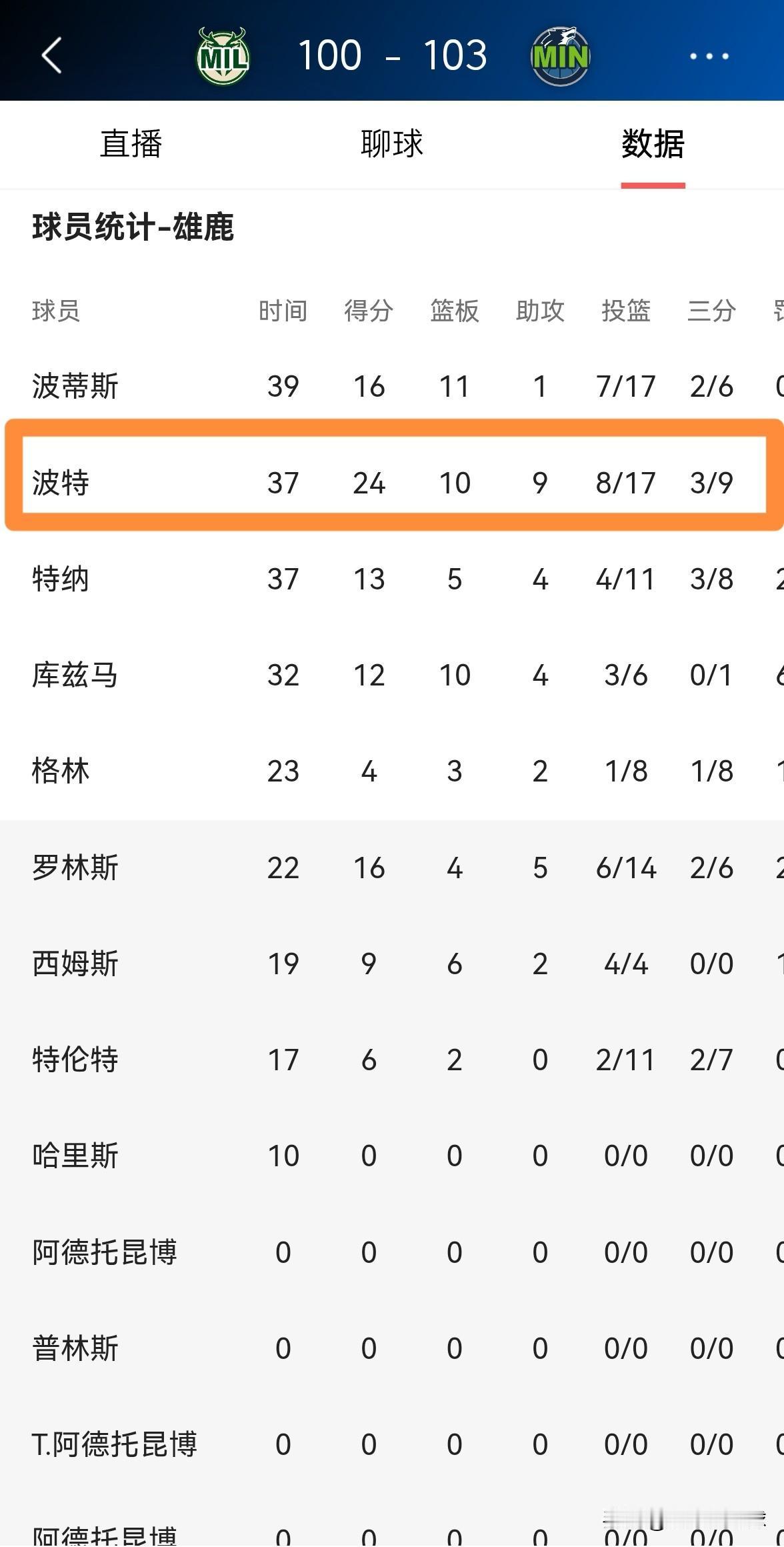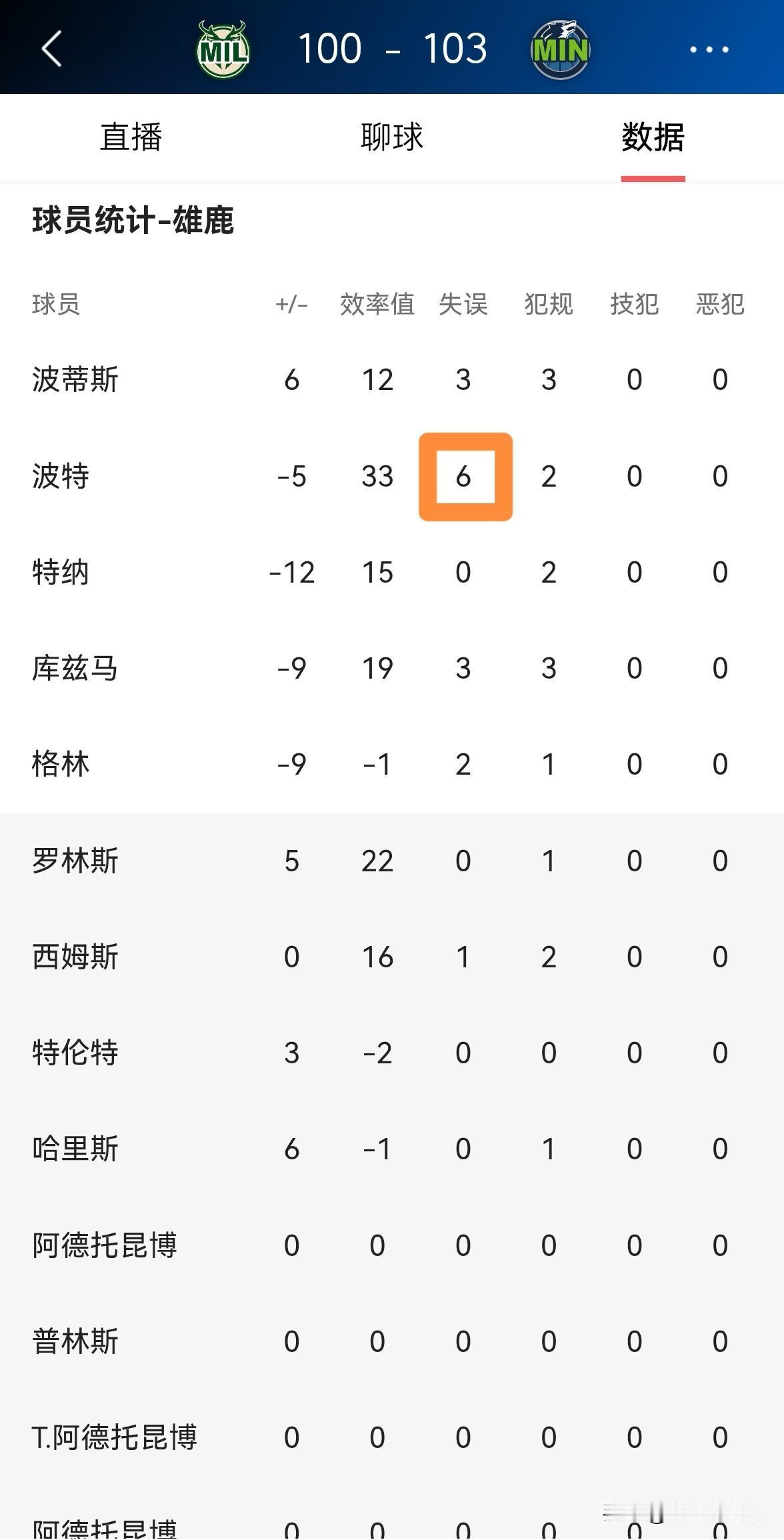 雄鹿大将小凯文-波特真是太敢失误了!在今天雄鹿客场以100:103惜败于森林狼的比赛中,小波特竟然出现了多达6次的失误。 全场比赛下来,小波特首发出战37分钟,投篮17中8,其中三分球9中3、罚球6中5得到24分10篮板9助攻4抢断1盖帽6失误。 毫不夸张的说,如果小波特能够少失误2次,那么雄鹿完全有机会赢下比赛。