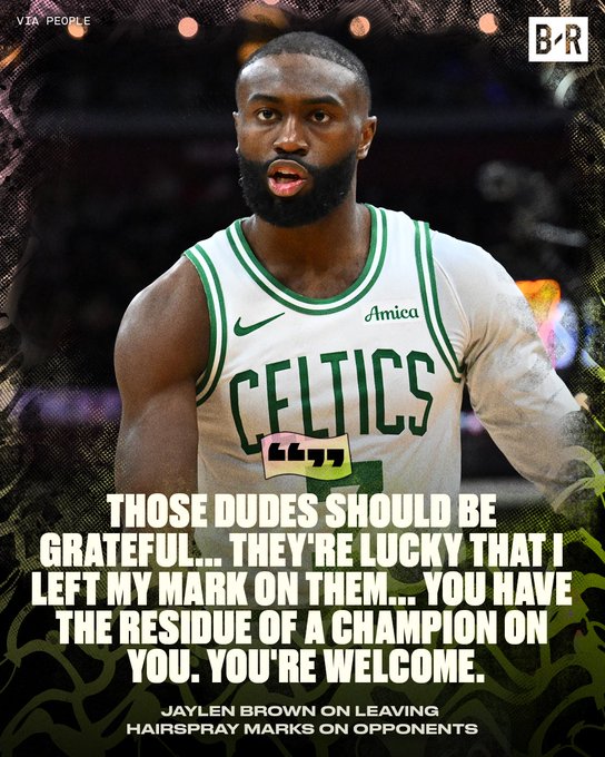 在此前的比赛中,有多位球员在防守杰伦-布朗的过程中因接触到其头部而在球衣上留下一块“黑斑”,这块“黑斑”曾引来球迷广泛讨论——不少人一度认为这是布朗把掩盖发际线问题的黑色发胶。