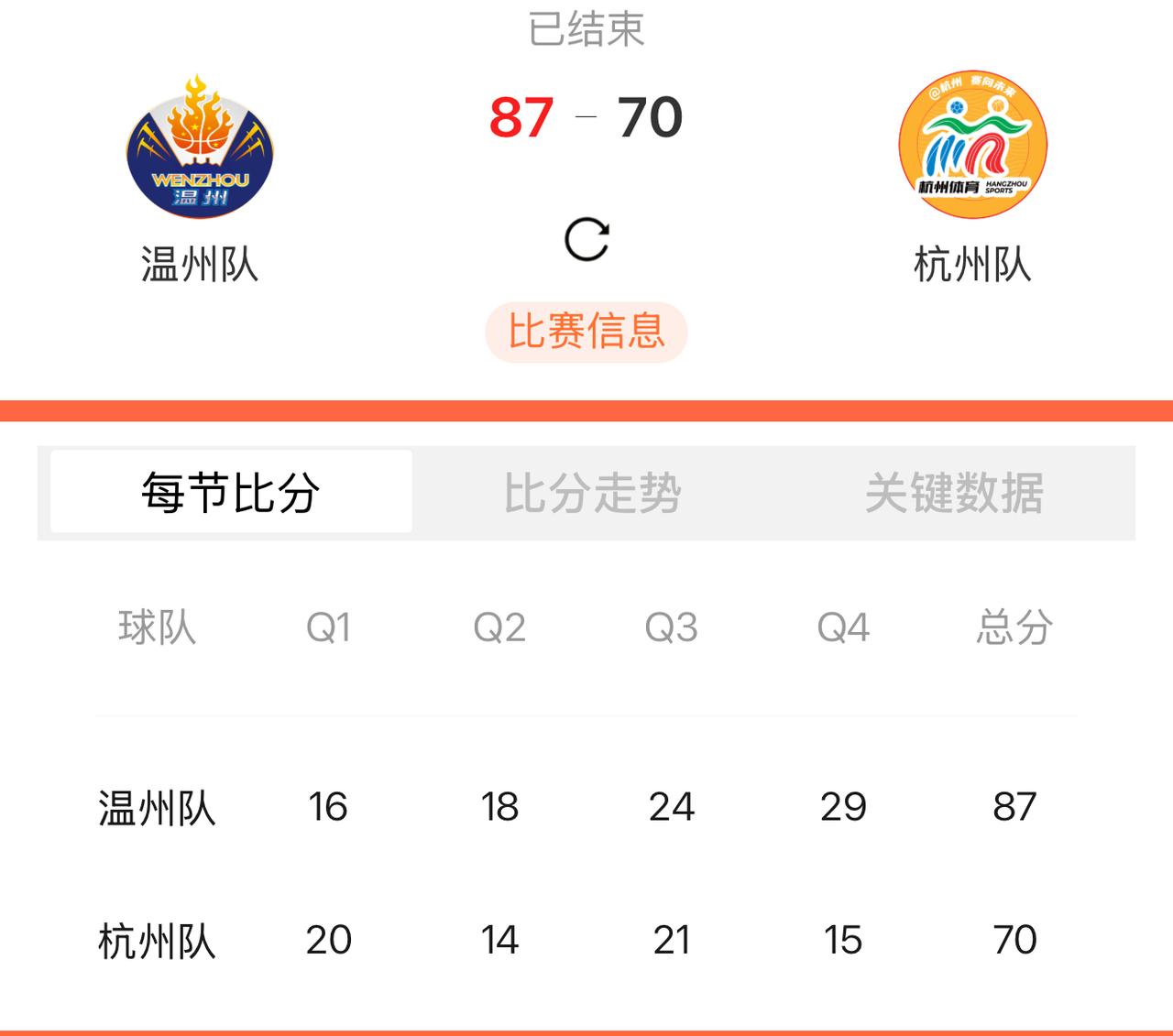 温杭二次大战在即,杭州想要冲到第一,需要赢温州18分,这现实吗? 温州队磕磕绊绊拿到了17连胜,杭州队现在缺席了第一得分手赵哲轩,却依旧打得顺风顺水,除了温州队,好像其他球队确实造成不了什么麻烦!也让大家看到了杭州队的板凳深度,所以现在的杭州可能赢温州18分有点难,但如果说要赢温州,还是很有机会的! 本场比赛是在杭州队主场,而且赵哲轩如果回归的话,还是非常期待杭州队能够赢下温州的,杭州队的三分是最大的优势,内线算是五五开吧,锋线稍微吃亏点,面对叶光辉和戴子特的锋线群估计是打不过的,所以归根结底,杭州队如果三分开了,稳赢温州!温州队 杭州队