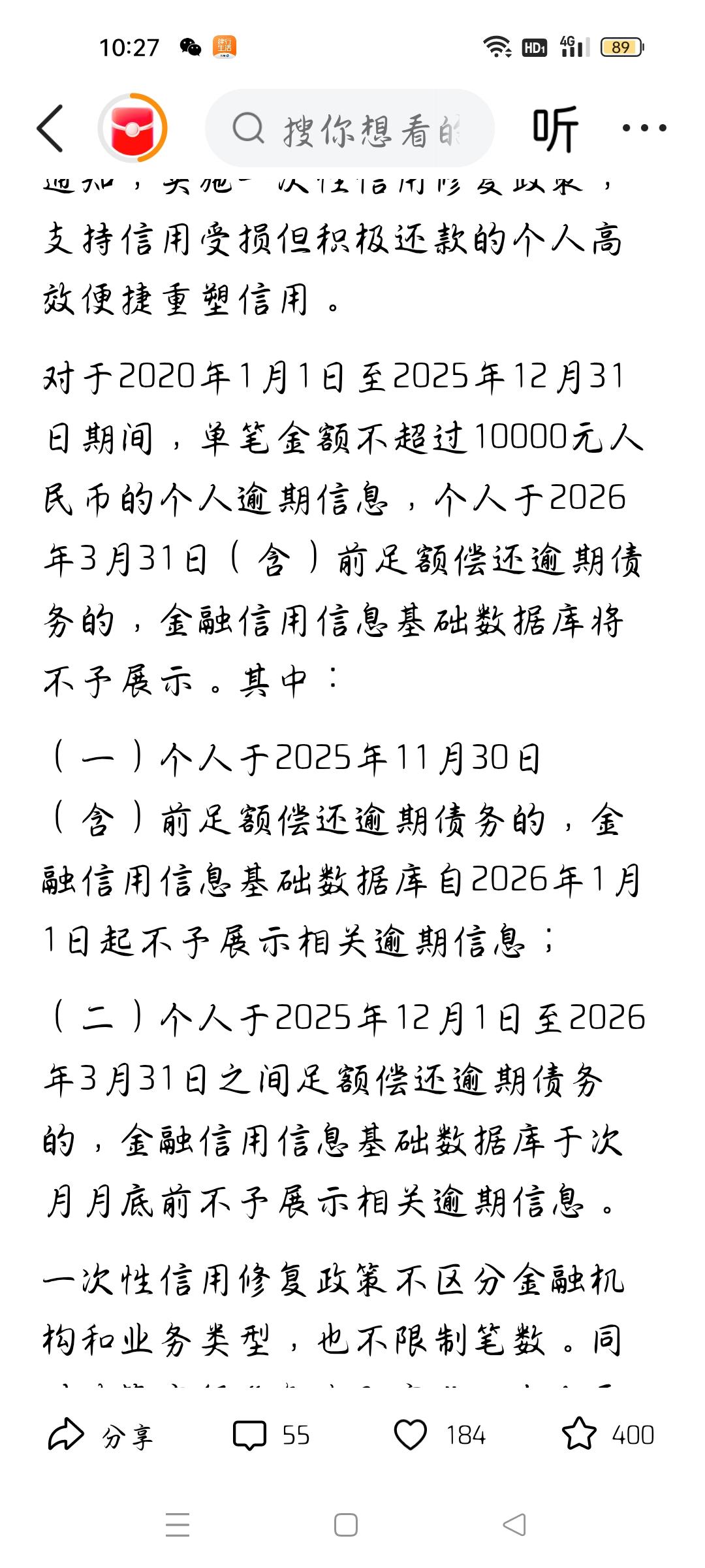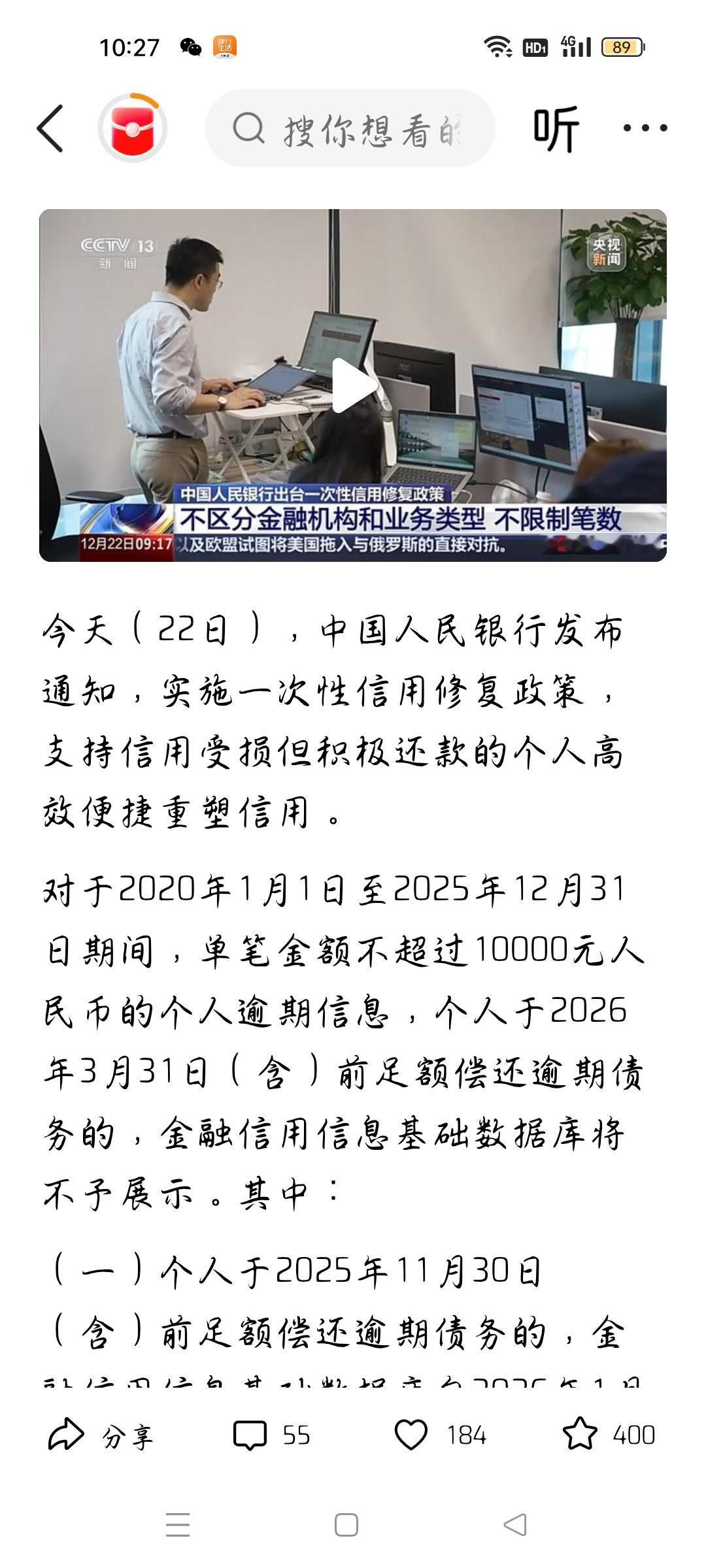 一次性信用修复政策来了,我想说 据央视新闻报道,12月22日,中国人民银行发布通知,实施一次性信用修复政策,支持信用受损且积极还款的个人高效便捷重塑信用,我想说,这一政策有何利好呢?个人还清逾期贷款,可以重塑信用,可以再从银行获得借款,可以说利好银行,银行可以收回贷款,而个人呢,可以再贷款,再消费,促进了贷款一生产一消费的良性循环,从而促进中国经济的发展。我说得对吗?欢迎评论。