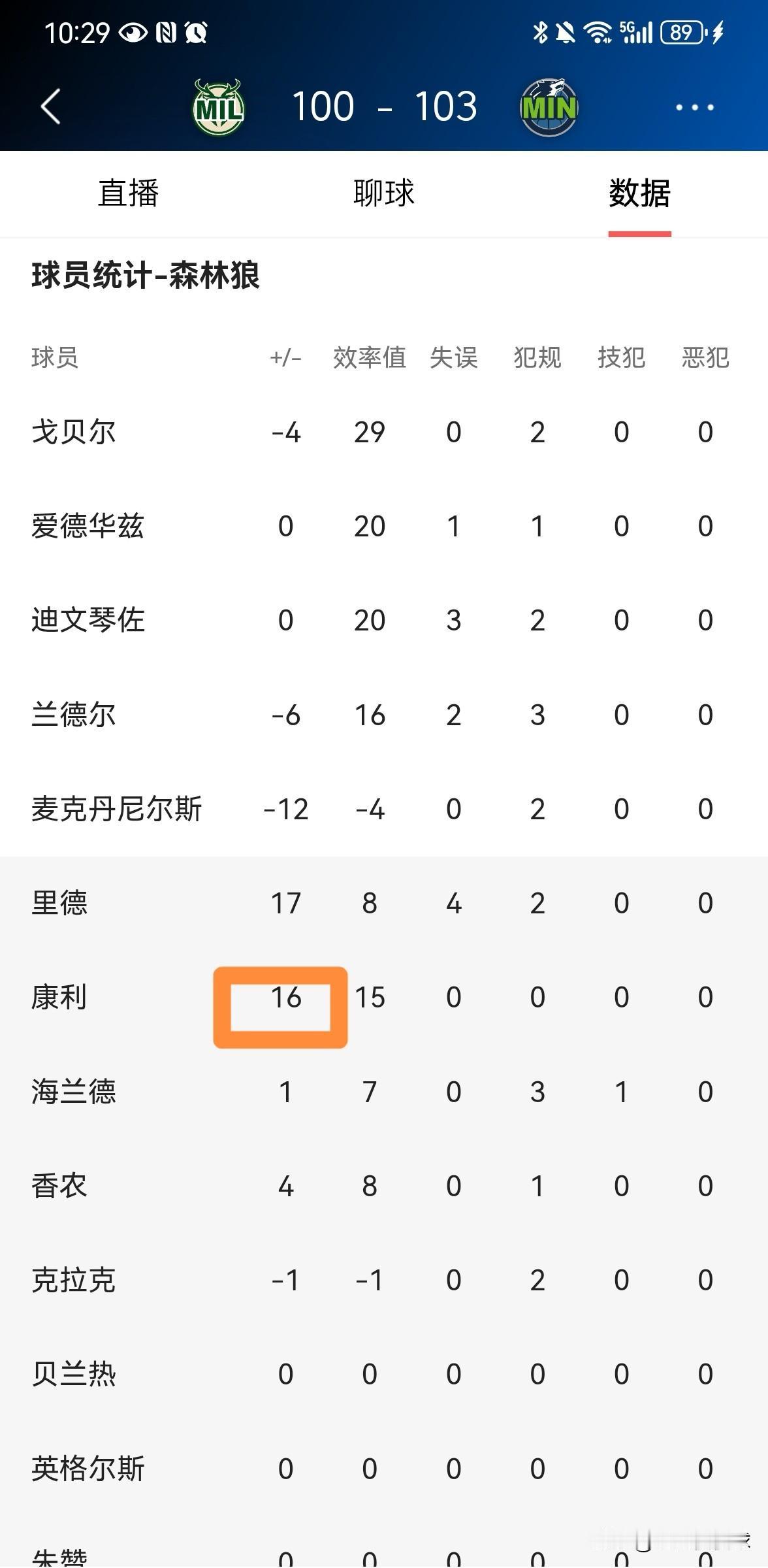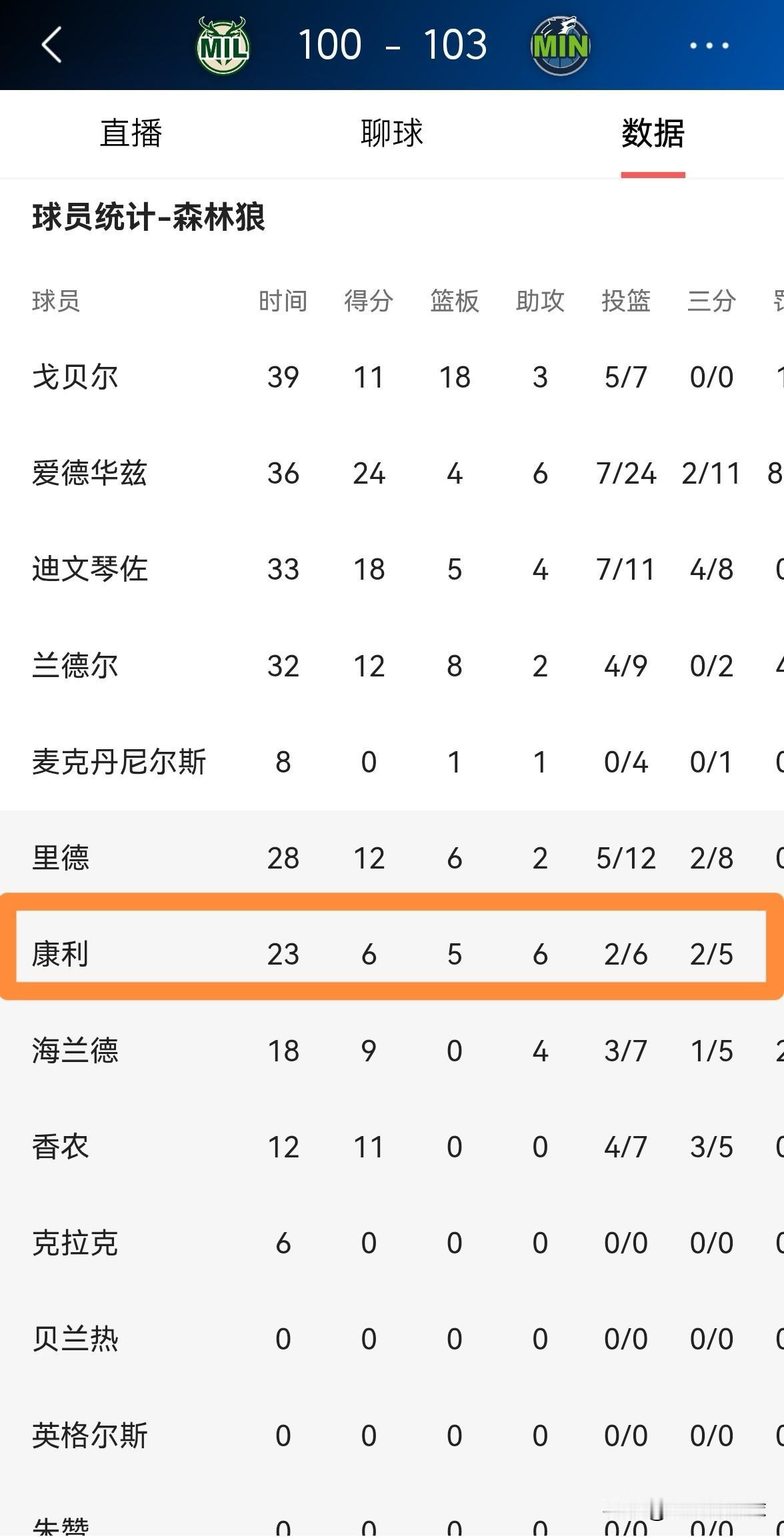 我忍不住要怒赞森林狼老将康利!在今天森林狼主场以103:100险胜雄鹿的比赛中,38岁的康利在攻防两端都打出了非常棒的表现。 全场比赛下来,康利替补出战23分钟,投篮6中2,其中三分球5中2得到6分5篮板6助攻1抢断2盖帽,没有出现任何的失误,他的场上正负值高达+16。 事实证明,当比赛进入到关键时刻的时候,老康利依然值得信赖,他的控场能力是森林狼其他后卫比不了的。