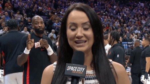 火箭球员杰夫-格林在比赛暂停时段被拍到在媒体镜头前,记者的身后手舞足蹈。
