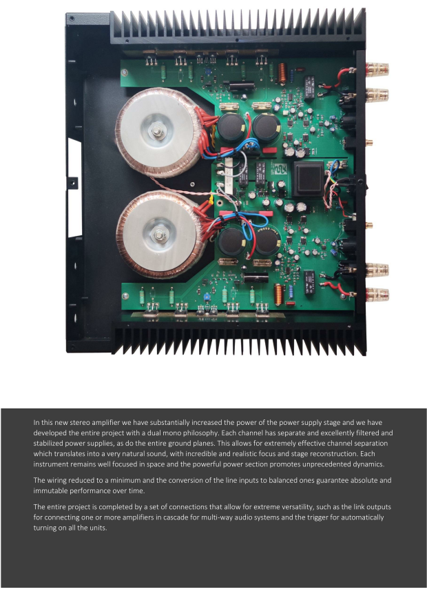 产品核心: 1. 电路与音质设计 双单声道架构:左右声道采用完全独立的功率放大级、电源供应及接地层,实现极佳的声道分离度。 平衡电路理念:全线输入转换为平衡式(XLR),并以此为设计核心,旨在实现顶级的音乐性、声音透明度和动态表现。 新一代低噪音电路:采用最新元件和电路设计,实现低噪音和高谐波对比度,提供纯净、精确的声音。