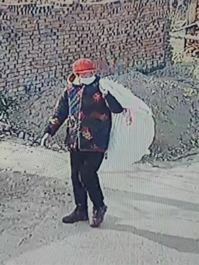走失者特征:穿黑底花棉袄、黑色裤子、红色鞋子,戴红色帽子、口罩,拿白色编织袋