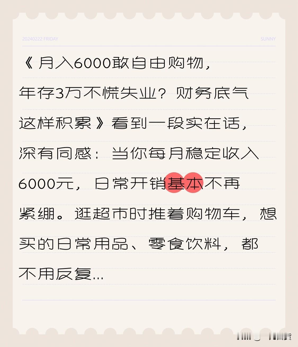 《月入6000敢自由购物,年存3万不慌失业?财务底气这样积累》 看到一段实在话,深有同感: 当你每月稳定收入6000元,日常开销基本不再紧绷。逛超市时推着购物车,想买的日常用品、零食饮料,都不用反复比价犹豫。哪怕水果标价十几块一斤,只要想吃,也能随手放进车里——这种“小小自由”,其实正是安稳生活的缩影。 而当一年能存下3万元,心里便会悄悄长出底气。哪怕突然面临失业变动,至少有一笔缓冲金支撑你寻找下一站,不至于瞬间手足无措。 💰 慢慢积累,慢慢获得选择的余地。 你现在的状态,靠近哪一种呢? 或者你觉得,每月/每年攒多少,才会让你觉得“踏实”? 来评论区聊聊吧~