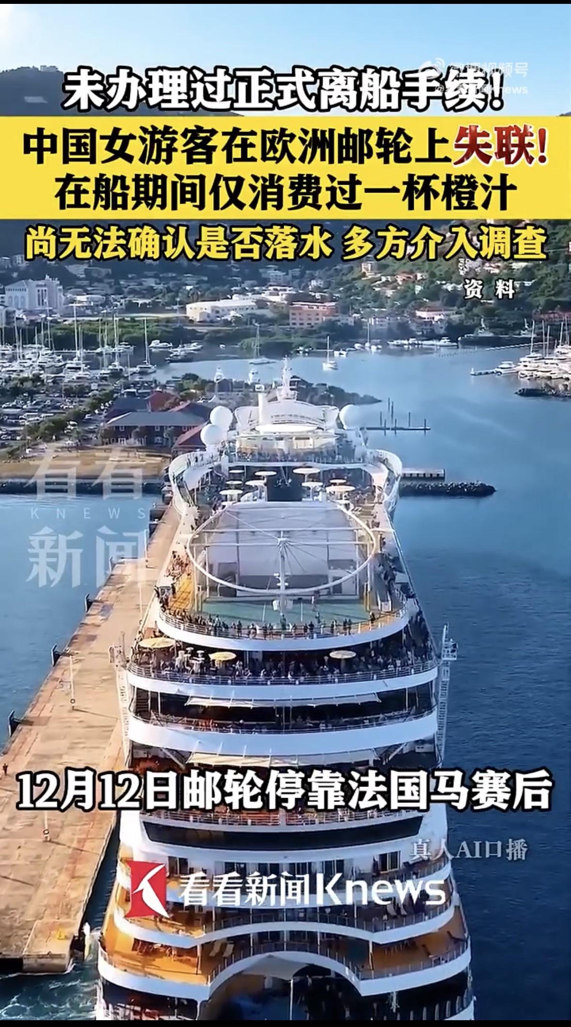 一个大活人,在豪华邮轮上消失了。欧洲邮轮上的中国女游客秦女士,至今下落不明,这事越想越后怕。 12月10日登的船,12日邮轮停靠法国马赛,人就没了踪迹。关键船上记录显示,她根本没在马赛正式下船!朋友查了她的消费,整趟行程只买过一杯橙汁。没落水警报,也没搜救报告,人就像在海上蒸发了一样。 茫茫大海,密闭邮轮,每一个细节都让人心里发毛。她当时经历了什么?现在人又在哪儿?这些问号揪着人心。任何一次失踪背后,都是亲人最漫长的煎熬。 出门在外,安全永远是第一道锁。希望调查早日给出答案,更盼望每一个旅途中的同胞都能平安回家。