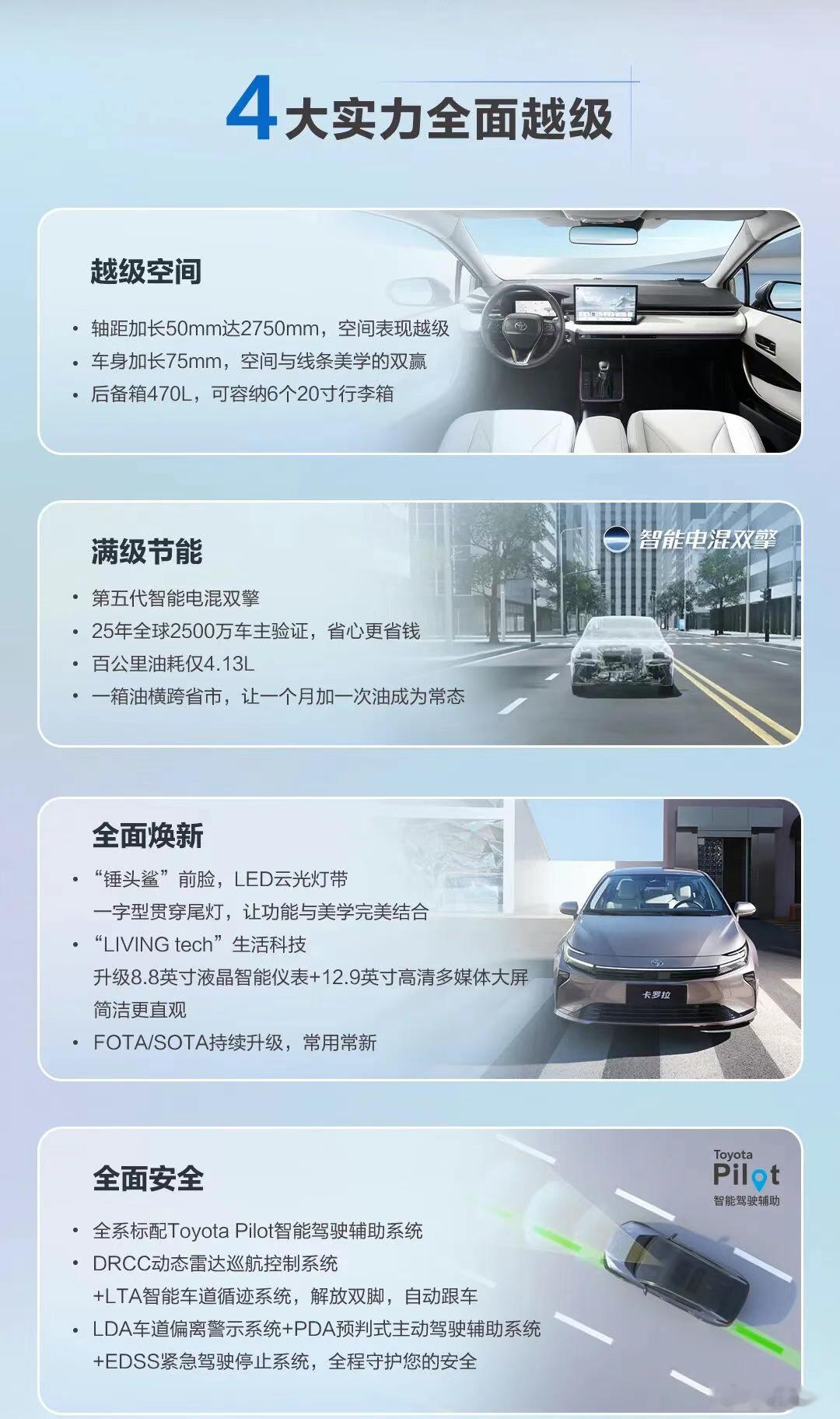 名车志观察 【丰田双车齐发,雷凌 L & 新款卡罗拉怎么选?】· 雷凌 L:12.98 万起,1.2T/2.0L/1.8L 混动三动力可选,2750mm 轴距 + 12.9 英寸中控 + 8155P 芯片,全系 TSS 3.0 智驾,适配华为 HiCar/Carlink;· 卡罗拉:直销 9.9 万起 + 限时 4000 购置税补贴,1.8L 混动(4.13L/100km)+2.0L 动力,4710mm 车长 + 锤头鲨颜值,丰田 Pilot 智驾;· 总结:预算紧买卡罗拉;要 1.2T 选雷凌 L;省油选混动;对于选择困难症来说,两车空间、屏幕等基础体验相似,驾驶质感、座椅舒适度等细节差异,可能成为决定因素。