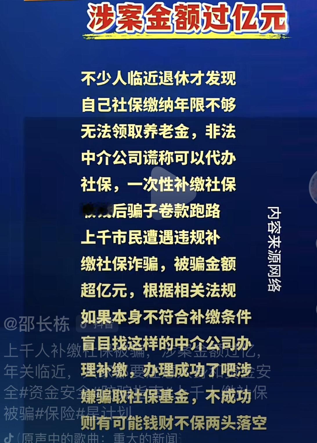 10几个w打了水漂,广州上千人一次性缴清社保被坑上亿! 广州上千人通过第三方代理平台补缴社保,原以为60岁就可以拿到退休金,可被告知缴费无效!第三方代缴平台你也敢信?这些所谓的公司能钻空子,就是利用正规企业补缴社保巨难这个漏洞。 其实,城乡居民养老保险可以补,城市自由职业社保和职工社保是不可以补的,但能否一次性补交完,要按当地政策执行。如果不能一次性补交,就只能一年一年交,直到交够,才能开始领养老金,没交够最低年限,即使年龄已经超过退休年龄,也不能领退休金。这个一定要到社保局去办理,由别人代就肯定钱没了。 关键是,为什么有些公司能钻空子,正规企业补交都特别难,为什么这种皮包公司能办,这才是可怕的事情。
