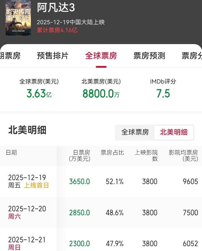 大皖新闻讯12月19日,詹姆斯·卡梅隆执导的科幻巨制《阿凡达:火与烬》(以下简称《阿凡达3》)在中美同步上映。截至12月21日,影片在中国内地票房约3.8亿元,加上之前的点映和零点场,总票房突破4亿元。相关数据显示,《阿凡达3》首周末北美票房8800万美元,全球票房约3.63亿美元。