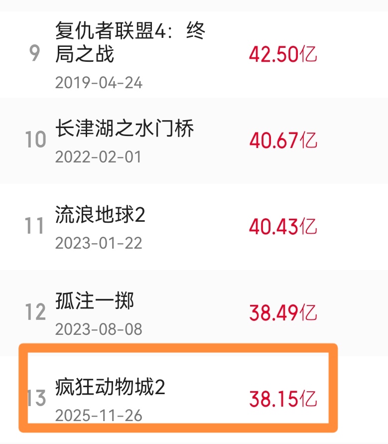 相反,原本因为《阿凡达3》来争抢排片,预测票房已经下调的《疯狂动物城2》,在两个数据平台的预测总票房双双再次来到40亿+。按照两个数据平台目前的预测,《疯狂动物城2》肯定会反超《孤注一掷》(38.49亿元),并且有望反超《流浪地球2》(40.43亿元)和《长津湖之水门桥》(40.67亿元),成为中国影史票房第十名。