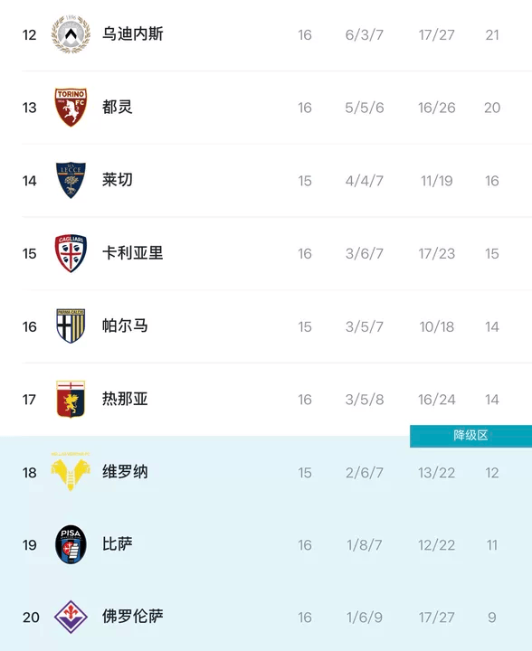 意甲积分榜:紫百合首胜距保级区5分,前五相互之间仅差1分