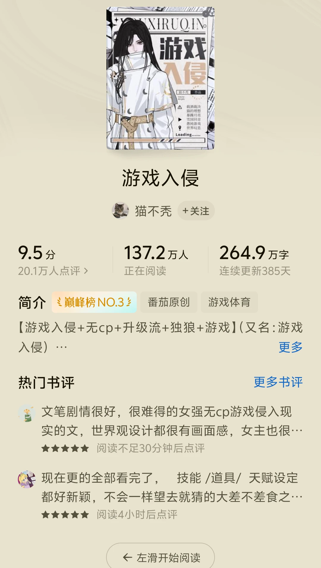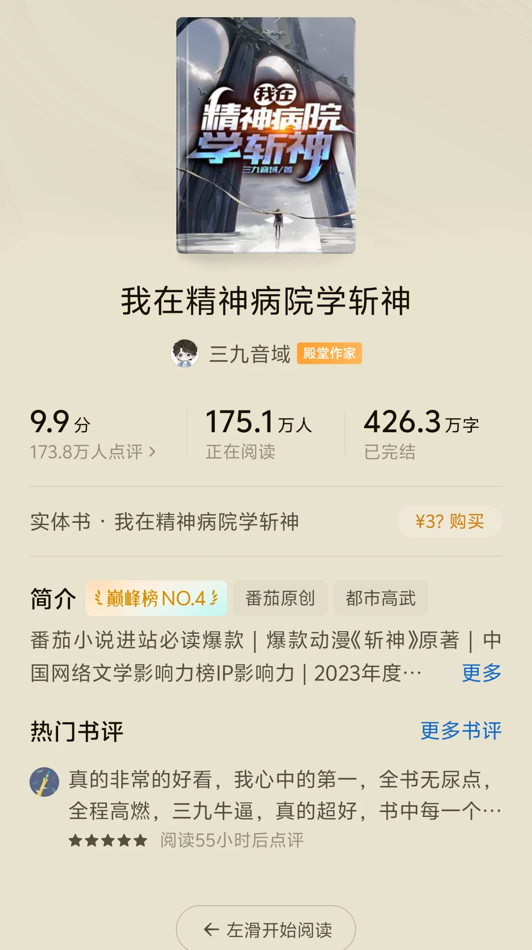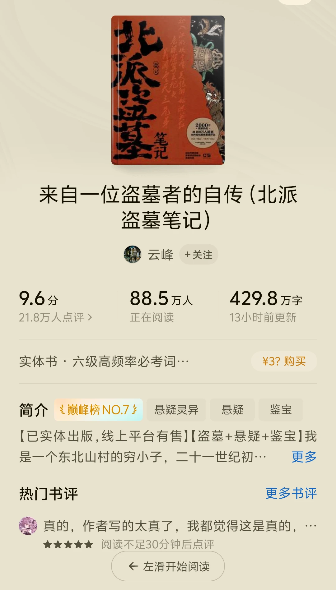 打开软件,看到了巅峰榜,这是众网友根据书籍质量、热度、评价等方面排出的前10名,有耳熟能详的,也有比较陌生的,你看过几本呢? 1、《我不是戏神》 2、《十日终焉》 3、《游戏入侵》 4、《我在精神病院学斩神》 5、《诸神愚戏》 6、《长生烬》 7、《北派盗墓笔记》 8、《冒姓琅琊》 9、《莫犯太岁》 10、《不死帝师》