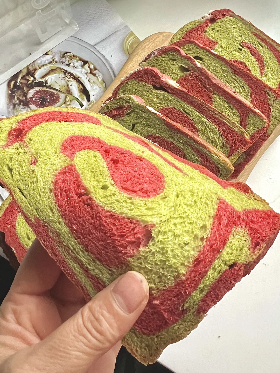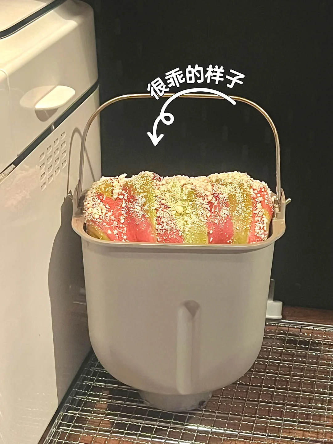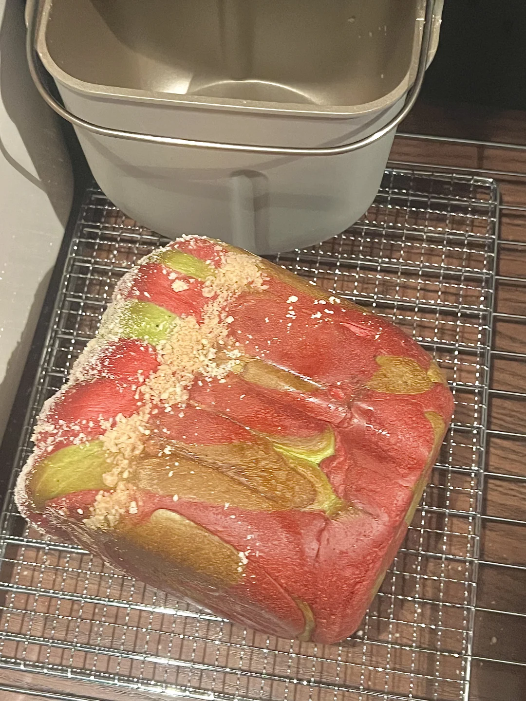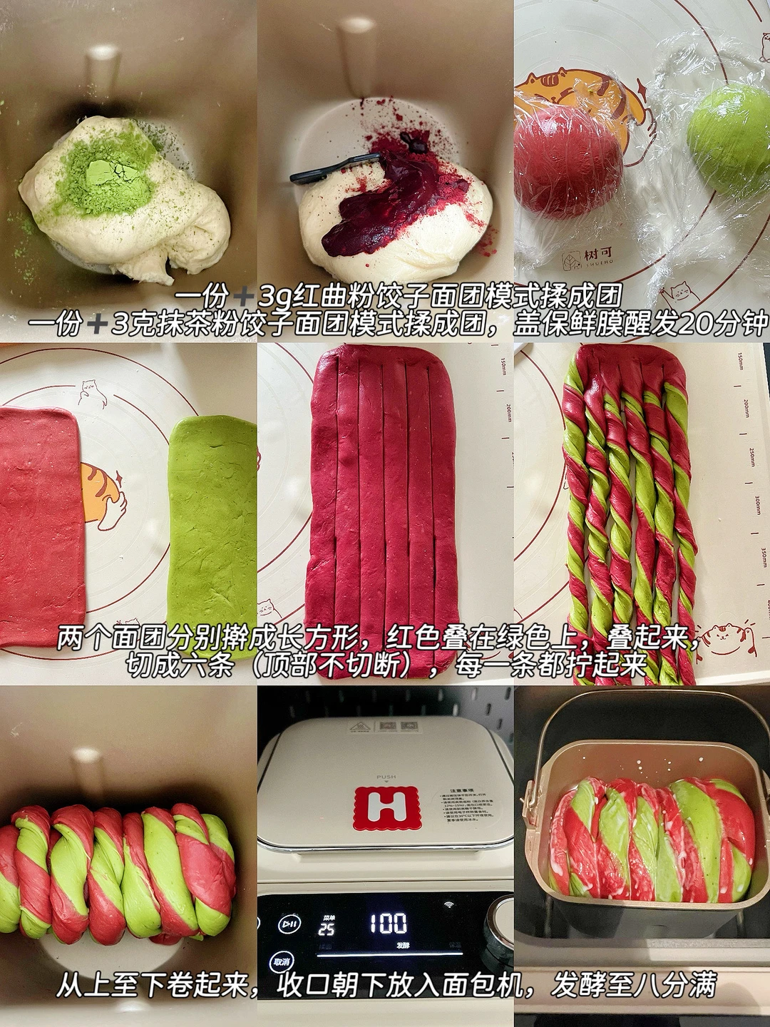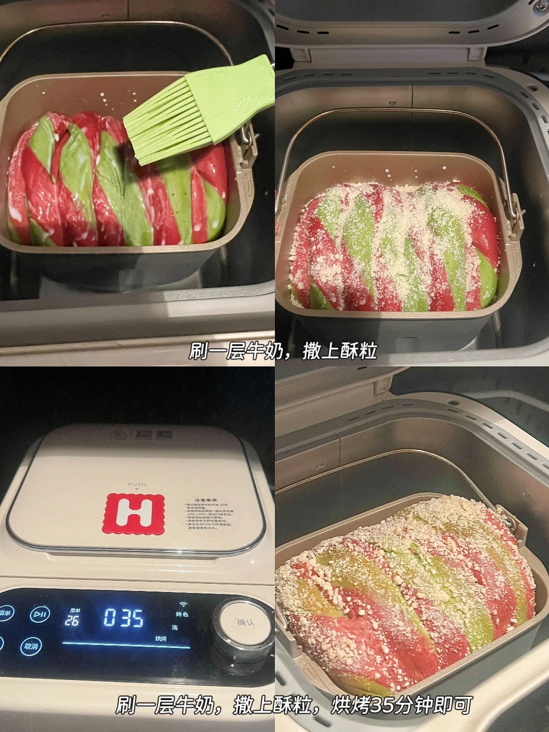 4️⃣两个面团分别擀成长方形,红色叠在绿色上,叠起来,切成六条(顶部不切断),每一条都拧起来,从上至下卷起来,收口朝下放入面包机,发酵至八分满(我这次用了1.5个小时)。刷一层牛奶,撒上酥粒,烘烤35分钟即可