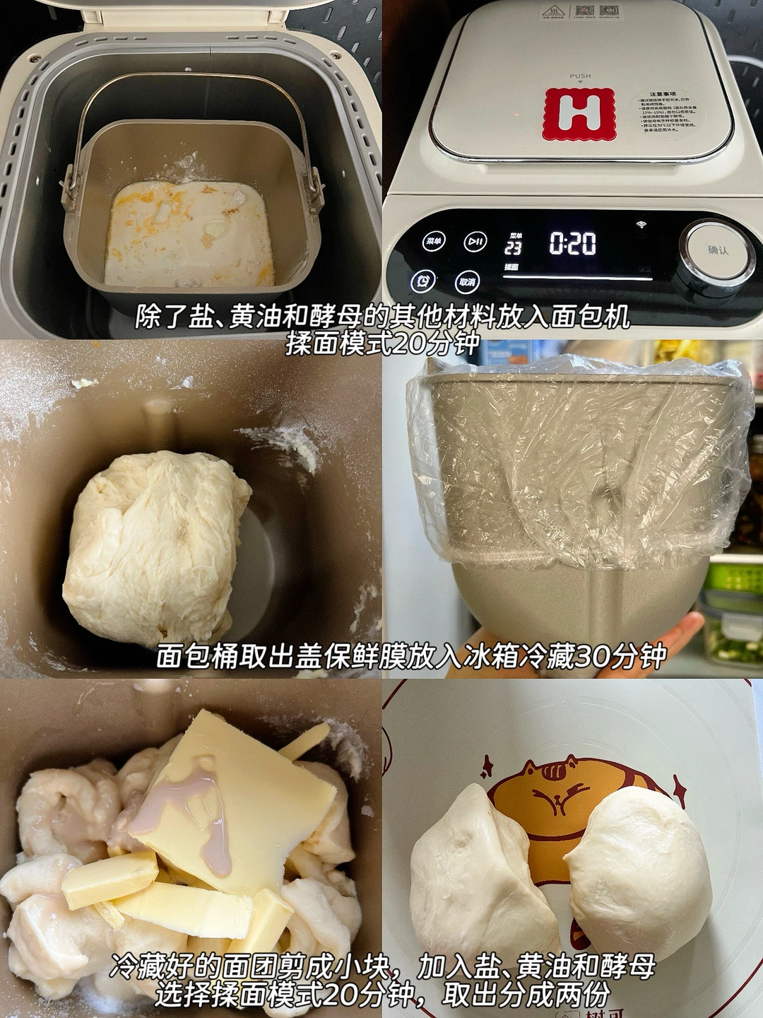 1️⃣除了盐、黄油和酵母的其他材料放入面包机,揉面模式20分钟