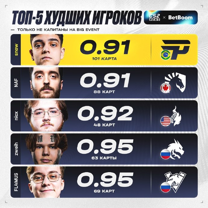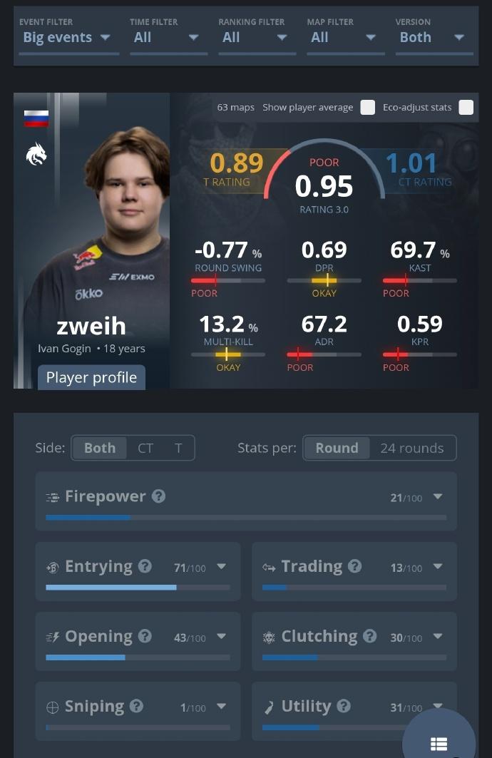 虎扑12月22日讯CS俄媒统计年度非指挥评分倒数榜单,基于大型赛事数据。zweih成为唯一入围TOP5的一线战队选手!