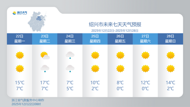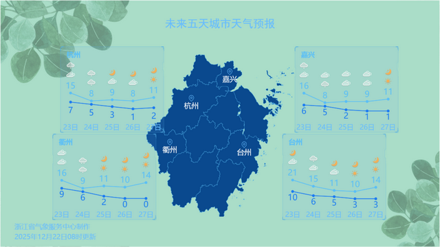 12月25日:浙南地区雨止转阴到多云,其它地区多云。