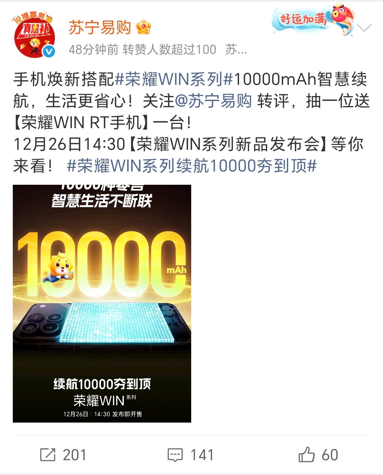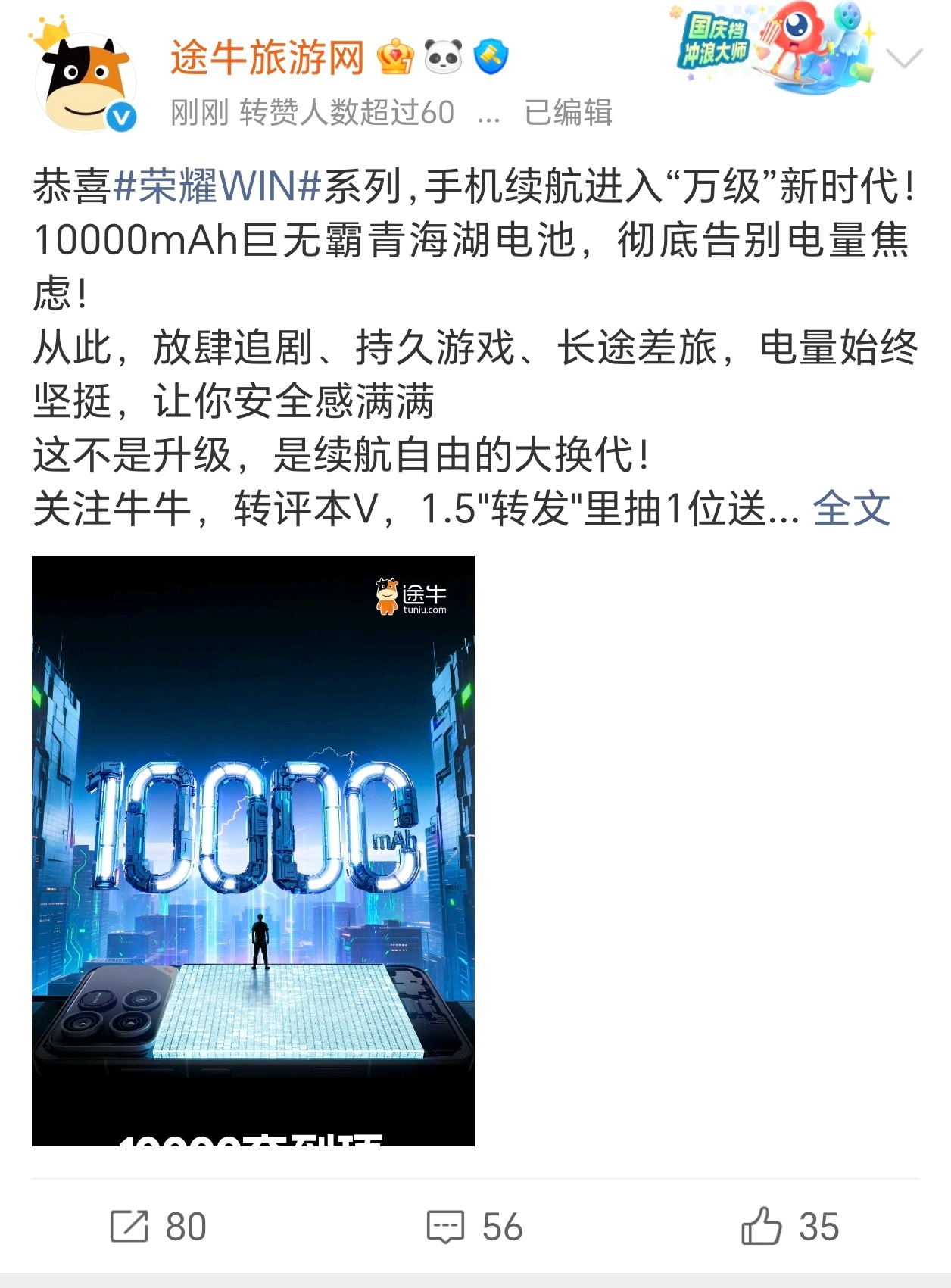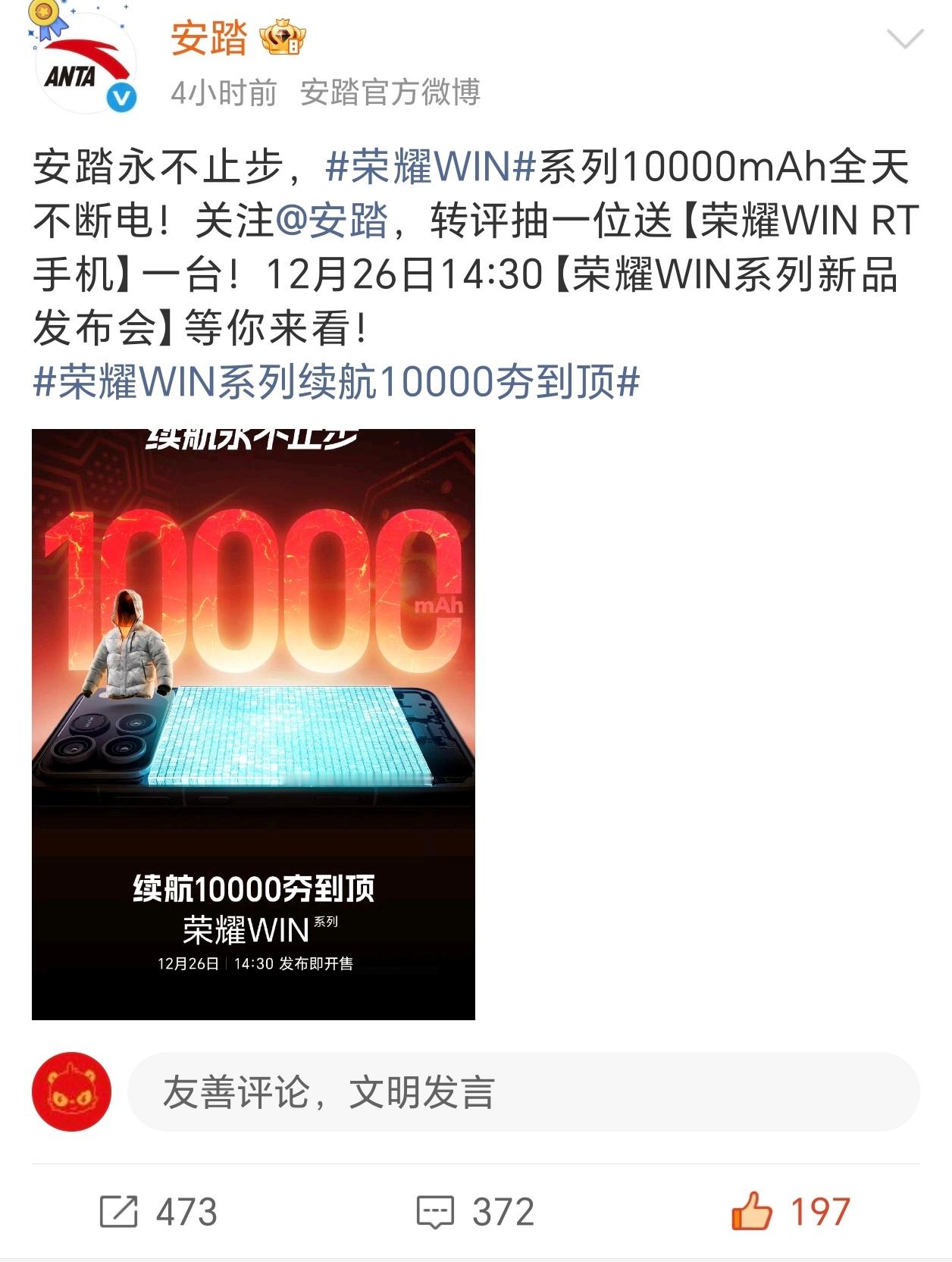 我勒个豆,荣耀WIN今天预热了一万毫安时超大电池,各大合作伙伴这是集体庆祝啊荣耀WIN系列续航10000夯到顶