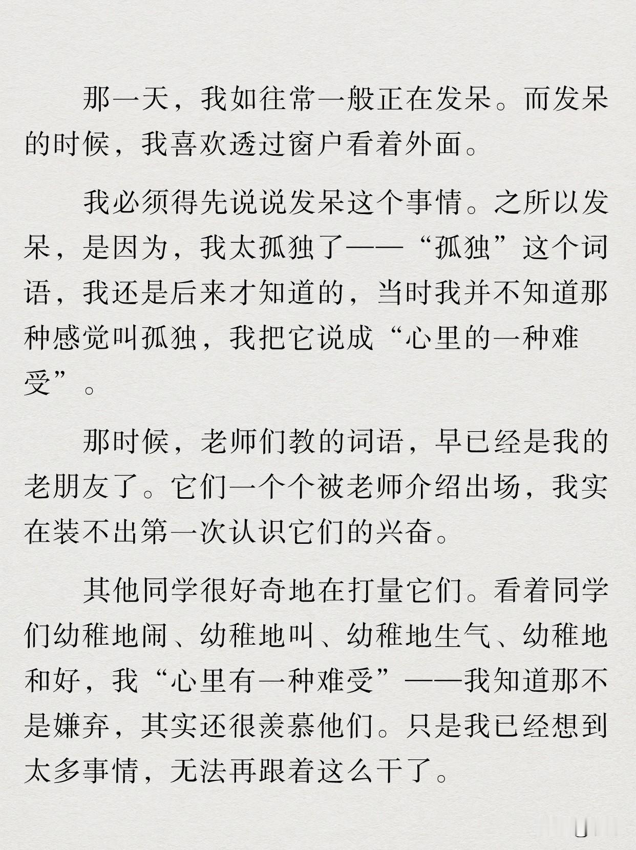 蔡崇达在《我人生最开始的好朋友》里写的这种感受,让我瞬间破防。原来那种早早到来的“心里难受”,叫做孤独。 长大后我才懂:能没心没肺地开心,是一种多么珍贵的能力。那些看起来“幼稚”的瞬间,其实是生命最本真的礼物。 如果你也曾是那个在窗边发呆的孩子,我想告诉你——现在的你,依然可以允许自己偶尔“幼稚”一回。 那些过早懂事的日子, 不是遗憾, 是让我们更懂得珍惜简单的快乐。读书笔记 书摘 蔡崇达金句