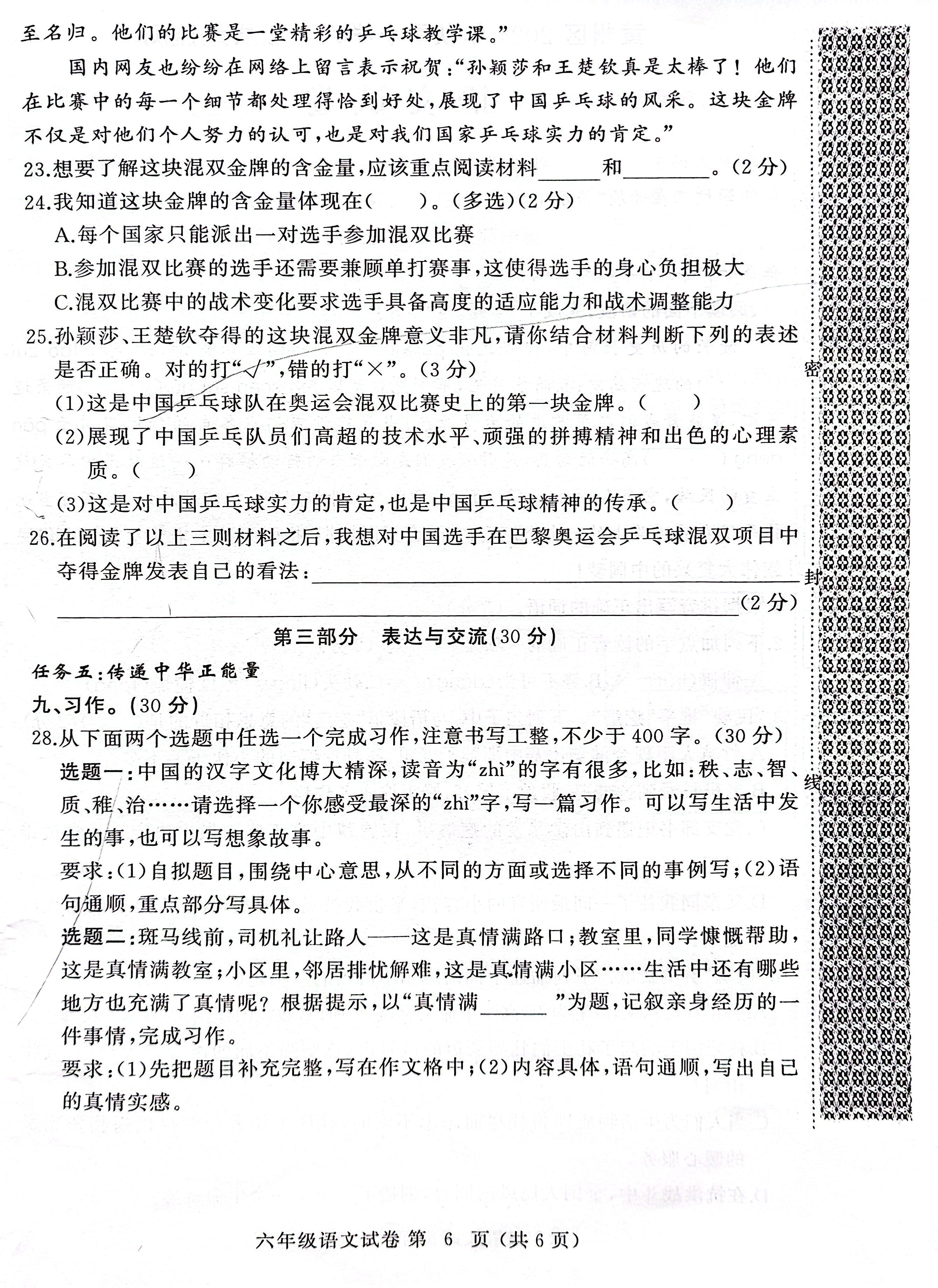 当做试卷的时候遇到孙颖莎王楚钦巴黎奥运会乒乓球混双冠军湖北期末语文试卷阅读——拆