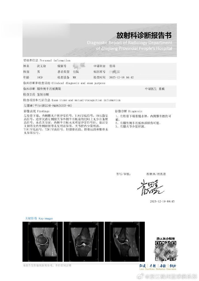 伤情通报|我俱乐部球员沈无敌因左膝外侧半月板撕裂,在俱乐部的安排下于12月19日在浙江省人民医院顺利完成手术,并于今日出院。