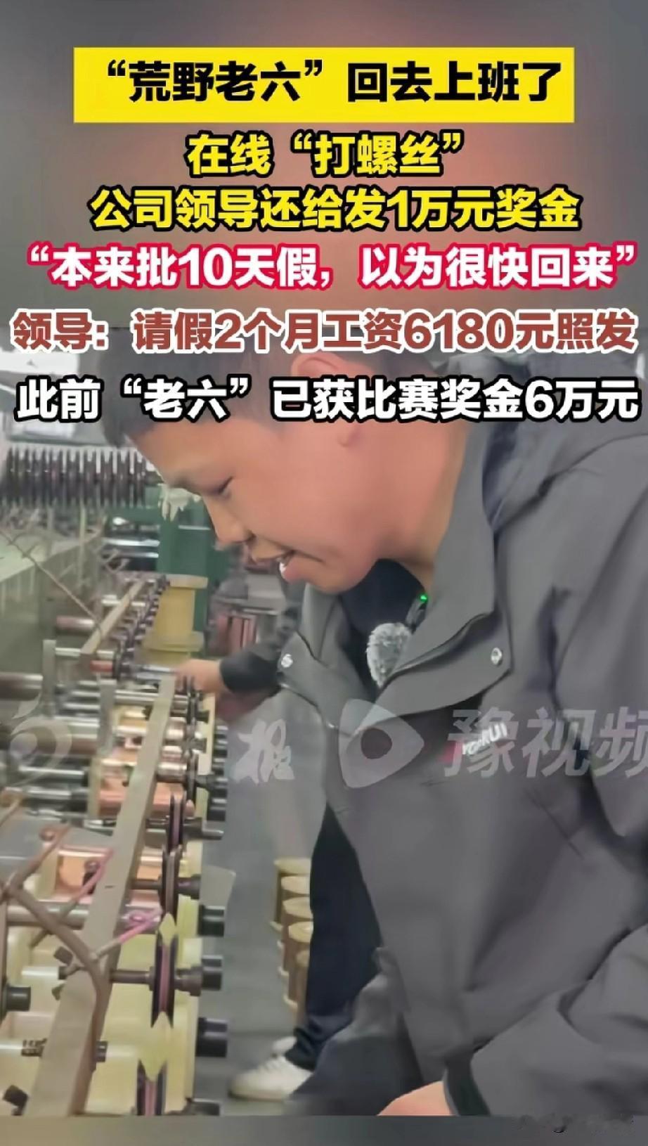 荒野老六回去上班了, 之前他去参加张家界荒野求生, 没想到会火出了圈, 还赢得了6万的奖金, 还用了非常多的时间, 本以为公司会开除的, 结果公司通知他可以回去上班, 接受采访的领导乐开了花儿, 表示之前他请了10天假, 以为他很快会回来, 结果却是遥遥无期, 放假两个月, 工资6180元照发不误, 应该是看他出名了, 才会有这样的待遇, 毕竟可以接受很多媒体采访, 自己的公司也可以出出名, 别人参加荒野求生, 出名后都去开了直播, 只有这个荒野老六, 还是乖乖回去上班了, 公司还奖励过他1万元, 可以说这个公司的领导很聪明, 人情世故这方面拿捏的死死的, 果然公司的大领导都不是白混的, 大家对于这位荒野求生老六以后的路怎么看? 荒野求生总决赛 张家界荒野 荒野求生老六 湖南荒野求生 荒野老六七星山 荒野求生驴哥 荒野求生打火石