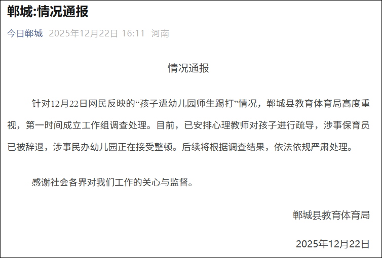 针对12月22日网民反映的“孩子遭幼儿园师生踢打”情况,郸城县教育体育局高度重视,第一时间成立工作组调查处理。目前,已安排心理教师对孩子进行疏导,涉事保育员已被辞退,涉事民办幼儿园正在接受整顿。后续将根据调查结果,依法依规严肃处理。