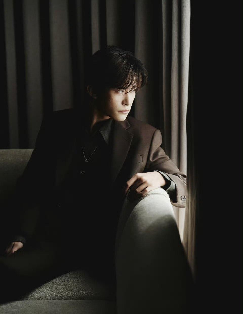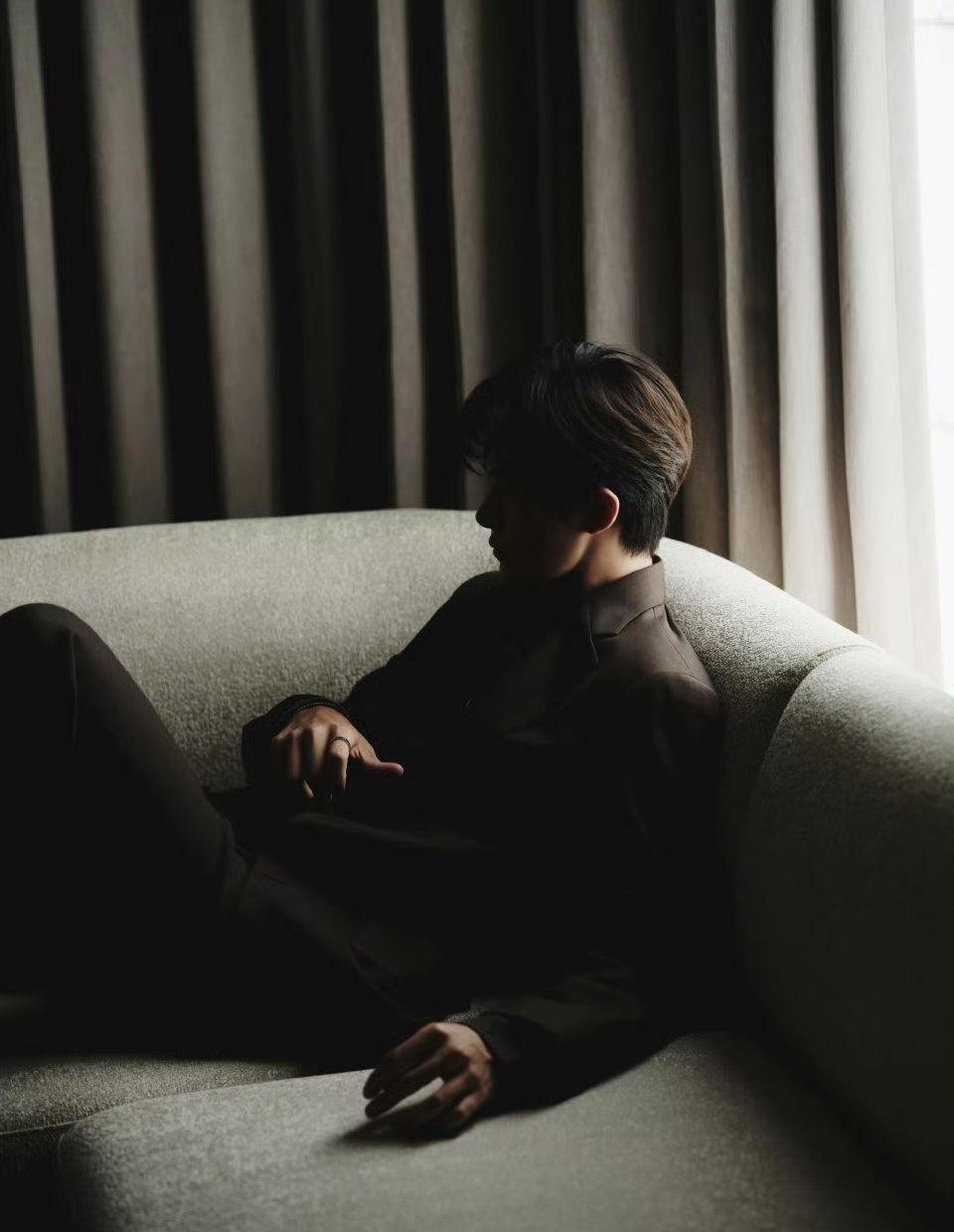 易烊千玺的气质比较清冷,搭配上这种深色系的西装和撞色内搭后,冷色调中带了一点暖意,这种色彩的情绪表达比较到位 易烊千玺西装look好带感
