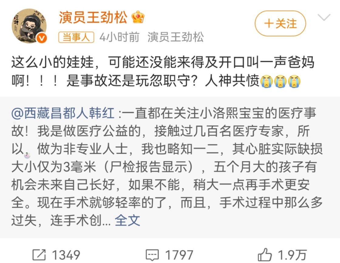 演员王劲松为小洛熙发声看到王劲松为小洛熙发声的消息,心里揪得慌,这么小的宝宝遭遇