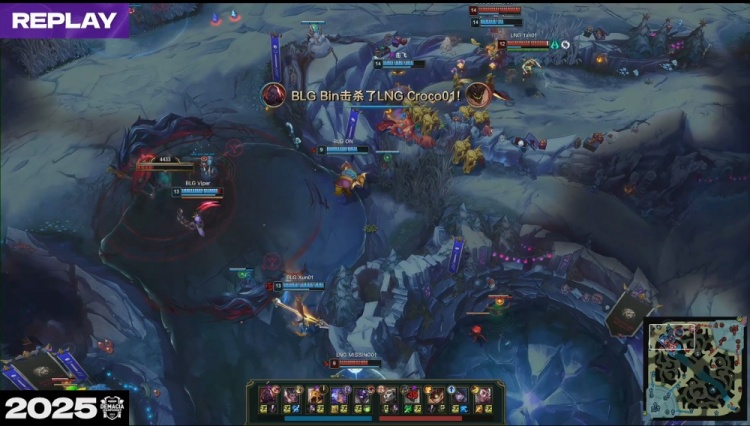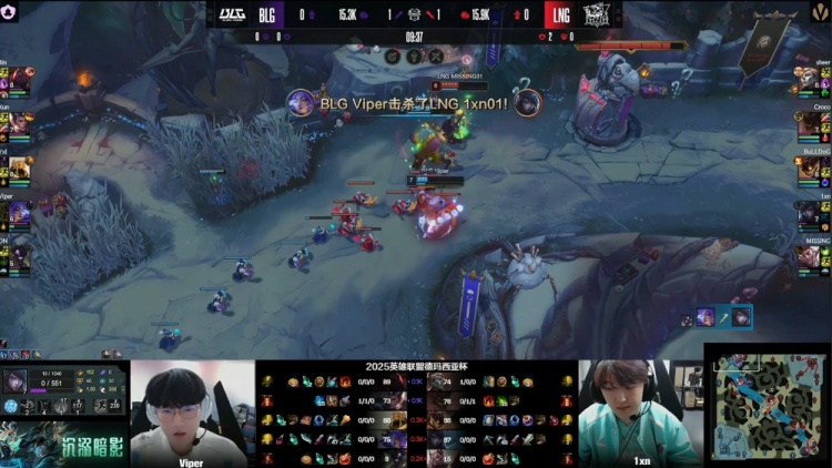 [27:16]Viper回家timing,LNG去开大龙,正面阿Bin击杀Missing后再杀1xn,Croco石头人送阿Bin三杀,LBG打出1换4,轻松拿到大龙,BLG经济领先5k。