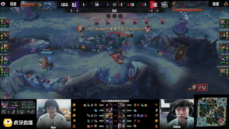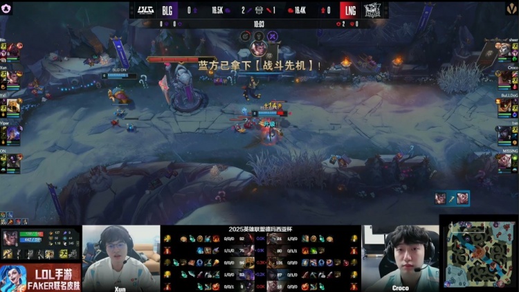 [15:28]先锋团,Croco石头人开大撞飞Xun赵信,双方不断拉扯点到为止,BLG拿到先锋。