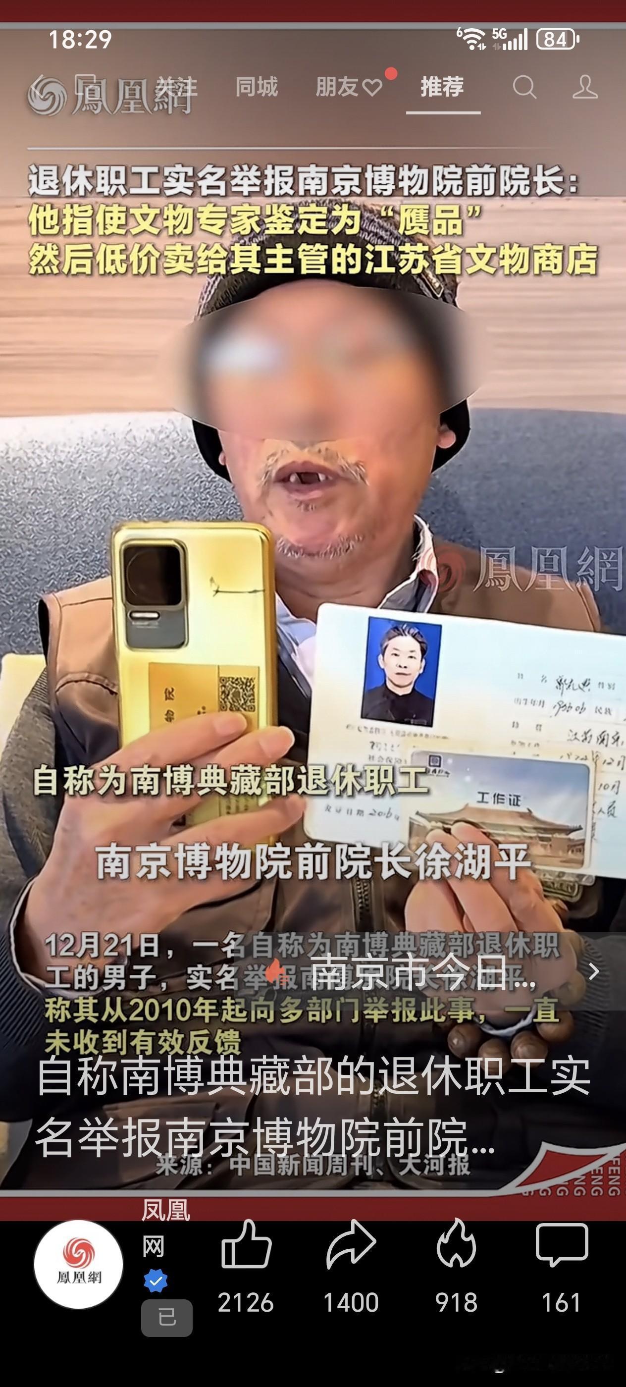 自称南博典藏部的退休职工实名举报南京博物院前院长徐湖平,说他指使文物专家鉴定为“赝品”,然后低价销售给其主管的江苏省文物商店,再转手倒卖给文物拍卖公司,从中牟取暴利 ,现在我有一个疑问,为什么早在20年前就有南京博物院职工实名举报前院长徐湖平一直都没有人接管呢?常言说“民不告,官不究”,民已经实名举报了怎么官方就没有人管呢?看来博物院收藏的古玩字画是国家的,谁愿意拿谁就拿呗,像南博徐湖平这样的监守自盗的人全国各地博物馆有多少?国家文物丢失了多少?国家文物保护部门应该统一进行文物信息采集、编号,不能再让老祖宗留下来的东西在我们这代人手里弄丢了,上对不起祖宗,下对不起子孙后代。