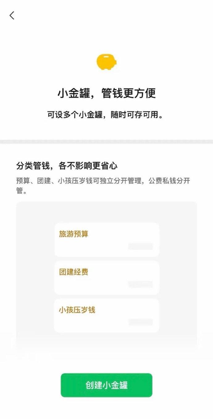 微信正在灰度测试的新功能「小金罐」,可以把存在微信钱包里的钱做分类管理,似乎是在