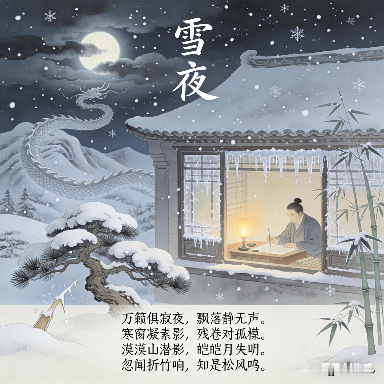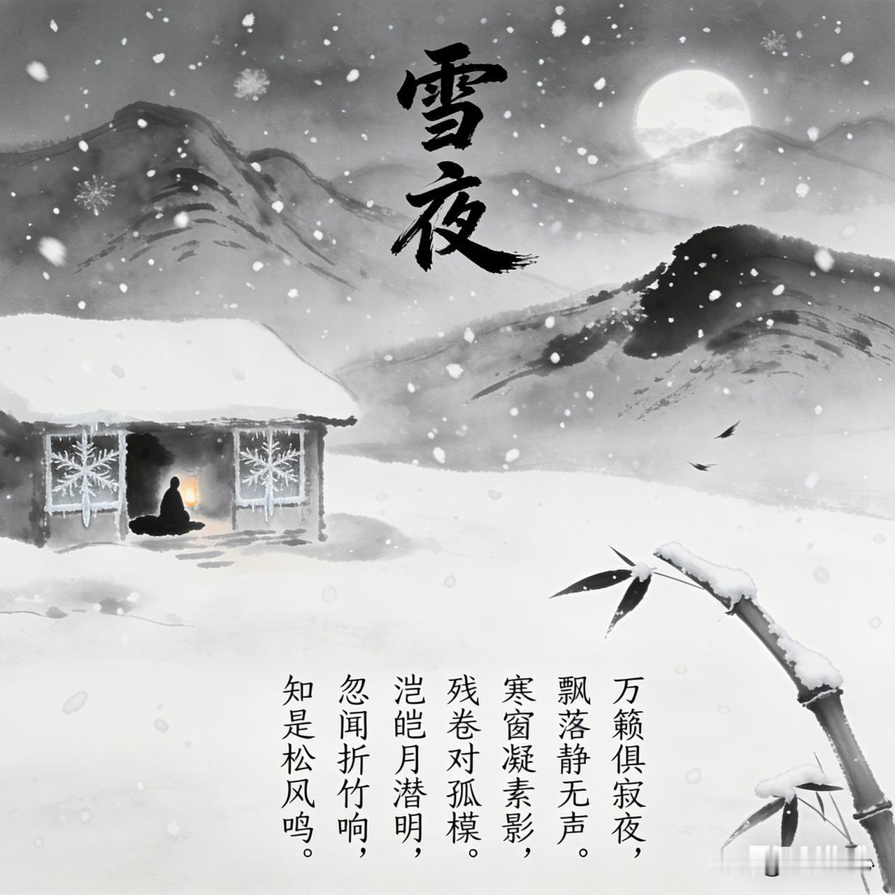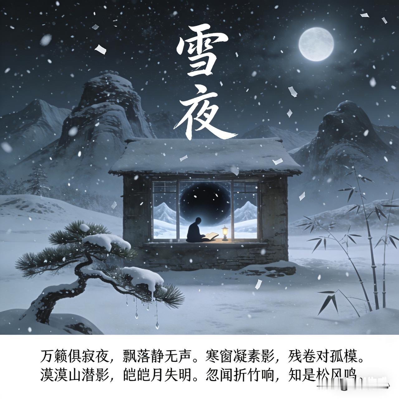 昨夜下了一场尺余厚的大雪,清晨起来扫完雪后见景生情,作了这首《雪夜》五言句诗词,望大家阅后能够喜欢。 《雪夜》乐韵诗心原创诗词: 万籁俱寂夜,飘落静无声。 寒窗凝素影,残卷对孤檠。 漠漠山潜形,皑皑月失明。 忽闻折竹响,知是枫风鸣。 这首诗描绘了一个寂静清冷的夜晚。万籁无声,雪花静静飘落。寒窗上映着素洁的光影,主人公对着残卷与孤灯。远处山峦隐匿,月色也被皑皑白雪掩盖而失色。忽然,传来折竹声响,起初以为有异动,细辨才知是松间风声,更增添夜的静谧孤寂与空灵之感。