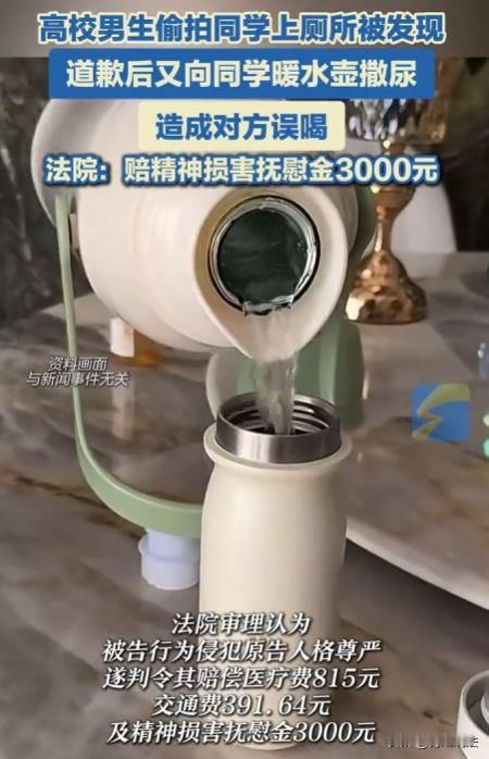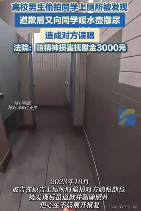 陕西西安,王松和廖明是大学同学,关系一般。王松发现廖明偷拍自己的隐私部位,廖明道歉后并删除照片。此后王松疏远廖明,廖明怀恨在心。廖明趁王松宿舍没人,往其保温壶撒尿,王松误喝后,经查看监控、检测确认是尿液后报了警,廖明被传唤。廖明道歉、写保证书后受到行政处罚和罚款,被学校记过。王松起诉索赔,最终法院判了。 (来源:裁判文书网、红星新闻、闪电新闻) 王松当天去上厕所,刚走到隔间门口,余光瞥见廖明鬼鬼祟祟地拿着手机,手机屏幕还亮着。 王松瞬间反应过来了,廖明这是在偷拍自己隐私部位,他冲过去,大声质问廖明,你干什么呢? 廖明一个劲地说对不起,然后当着王松的面,删除了拍的照片。 从那之后,王松对廖明避之不及,每次在校园里碰到廖明,王松都远远绕开,实在绕不开,也只是冷冷地打个招呼。 廖明觉得不就是偷拍了一下嘛,又没造成什么后果,还至于这么小气,一直疏远自己吗? 廖明暗自发誓,一定要找机会报复王松。 今年3月13日,廖明得知王松宿舍的人都出去上课了,只有王松一个人去了图书馆,他觉得机会来了,偷偷来到王松的宿舍。 他轻轻推开宿舍门,四处张望了一下,确定没人后,径直走到王松的桌子前,看到王松的保温壶放在桌上,他打开保温壶,解开裤子往保温壶里撒了尿。 撒完后,他赶紧把保温壶盖好,又检查了一下周围,确定没有留下什么痕迹,才离开了宿舍。 王松从图书馆回来后,顺手拿起保温壶就喝了一口,刚喝下去,他就感觉味道不对,还有一股刺鼻的尿骚味。 王松跑到宿舍楼下的监控室,要求查看监控。 监控画面清晰地显示,廖明趁宿舍没人的时候,进了他的宿舍,还对他的保温壶做了手脚。 王松拿着监控视频,跑到学校保卫处,要求保卫处处理这件事。 保卫处的工作人员看了监控视频后,也觉得事情很严重,立刻联系了廖明,廖明被叫到保卫处后,一开始还不承认,但在监控视频的铁证面前,他不得不低下了头。 保卫处的人对廖明进行了批评教育,并建议王松报了警。 很快,民警赶到学校,将廖明传唤到了派出所。 民警告诉他,他的行为已经涉嫌违法,必须为自己的行为负责,廖明这才意识到事情的严重性。 3月26日,廖明在民警和学校老师的陪同下,来到王松的宿舍,向王松道歉。 他低着头说,王松,我知道错了,不该偷拍你,更不该往你保温壶里撒尿,请你原谅我。 王松看着他,没有说话。 廖明见王松不吭声,又拿出事先写好的保证书,递给了王松。 王松接过保证书,看了一眼,随手扔到一边。 4月26日,根据调查结果,对廖明作出了行政处罚决定。 廖明因侵犯他人隐私和故意损毁他人财物,被处以500元的罚款和拘留的处罚。 4月27日,学校也根据校规校纪,对廖明作出了记过处分。 廖明得知这个结果后,后悔得肠子都青了,他没想到自己的一个冲动行为,会给自己带来这么严重的后果。 王松觉得这件事给自己造成了很大的伤害,不仅身体上受到了影响,精神上也受到了极大的刺激。 他又起诉了廖明,要求廖明赔偿精神损失费各2万,另外还有医疗费815元、交通费391.64元,合计41206.64元。 廖明偷拍王松隐私部位,可是严重侵犯了王松的隐私权。 根据《民法典》第1032条规定,自然人享有隐私权。任何组织或者个人不得以刺探、侵扰、泄露、公开等方式侵害他人的隐私权。 廖明拿着手机偷拍王松上厕所的这种隐私场景,明显就是刺探他人隐私。 而且,该偷拍行为,根据《治安管理处罚法》第42条规定,有偷窥、偷拍、窃听、散布他人隐私行为的,处五日以下拘留或者五百元以下罚款;情节较重的,处五日以上十日以下拘留,可以并处五百元以下罚款。 廖明偷拍王松隐私部位,虽然情节可能不算特别严重,但也违反了这条规定,要受到相应处罚。 廖明往王松的保温壶撒尿,在法律上需要要承担什么后果呢? 廖明往王松保温壶撒尿,这不仅是对王松财物的故意损毁,还严重侵犯了王松的人格尊严。 《民法典》第238条规定,侵害物权,造成权利人损害的,权利人可以依法请求损害赔偿,也可以依法请求承担其他民事责任。 王松的保温壶因为廖明的行为受到了污染,不能正常使用了,廖明就得承担赔偿的责任。 廖明往王松保温壶撒尿这种恶劣行为,让王松在不知情的情况下误喝,对王松的人格尊严造成了极大的伤害。 依据《民法典》第1179条规定,侵害他人造成人身损害的,应当赔偿医疗费、护理费、交通费、营养费、住院伙食补助费等为治疗和康复支出的合理费用,以及因误工减少的收入。 法院审理认为,廖明偷拍王松隐私部位和往王松保温壶里撒尿的行为,严重侵害了王松的人格权,给王松造成了身体和精神上的伤害,考虑到廖明的行为,存在故意性和恶劣性,以及给王松造成的实际伤害, 最终,法院判决廖明赔偿王松医疗费、交通费共计1206.64元,精神抚慰金3000元。