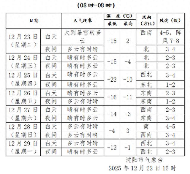 受西伯利亚冷空气南下的影响,预计明天(23日)早晨至白天,沈阳市有中到大雪,东南部有大到暴雪,并伴有寒潮大风天气。