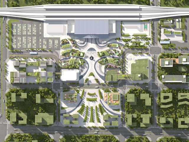 在生态保护与景观打造上,项目坚持“与原生环境共生”的理念:施工中对边坡、便道等临时用地及时复垦复绿,选用本土适生植物快速恢复生态;站区景观以“一步一景”为导向,优选狐尾椰、蓝花楹等植物,以常绿落叶乔木组合构成“四季观景”格局并融入海绵城市与地域文化城市家具,让建筑群自然融入环境,为旅客营造“人在画中游”的绿色出行体验。