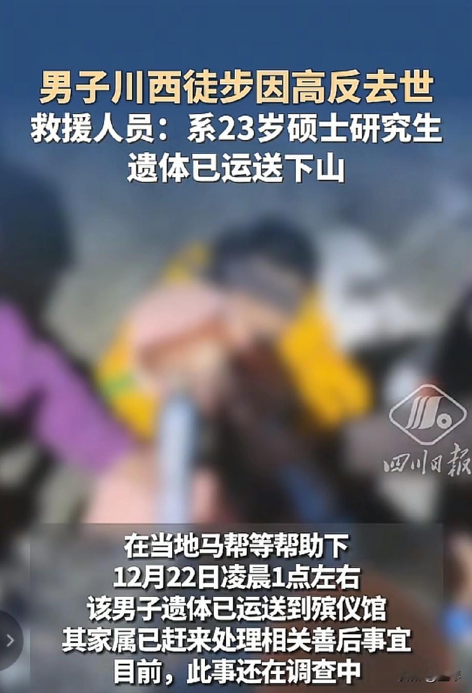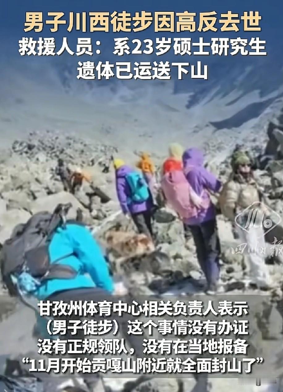 23岁研究生徒步川西高原,因高反去世,请别让“说走就走”变成生命终点。 23岁,本该是人生中最朝气蓬勃的年纪,一名研究生却在徒步川西高原的途中,因高原反应不幸离世,这则消息让无数人扼腕叹息。 川西的雪山巍峨、草甸辽阔,吸引着一批又一批户外爱好者奔赴而来。可很多人只看到了风景的瑰丽,却低估了高原的凶险。这位年轻的研究生,或许怀揣着对远方的向往,或许想在旅途中挑战自我,却没料到,一次看似平常的徒步,竟成了永别。 高反从不是“忍一忍就能过去”的小毛病。头痛、胸闷、呼吸困难,这些都是身体发出的预警信号。在高海拔地区,一旦出现不适,最正确的做法就是立刻下撤、及时吸氧,而非抱着“再坚持一下就能看到更美的风景”的侥幸。 更别提未经报备闯入未开发区域,缺少专业装备和领队陪同,这些行为都在无形中放大了风险。 近年来,“小众徒步”“野线穿越”成了社交平台上的热门标签,不少人跟风踏上征程,却忽略了背后的安全隐患。 高原的天气瞬息万变,前一秒晴空万里,下一秒可能就狂风骤雨;看似平坦的路面,或许暗藏着沼泽和碎石。没有充足的准备、专业的知识,贸然前往,无异于拿生命冒险。 风景永远都在,但生命只有一次。对于每一位户外爱好者而言,敬畏自然、遵守规则,做好万全准备,才是对自己、对家人最基本的负责。 别让一场说走就走的旅行,变成一场无法挽回的悲剧。 川西 户外安全警示
