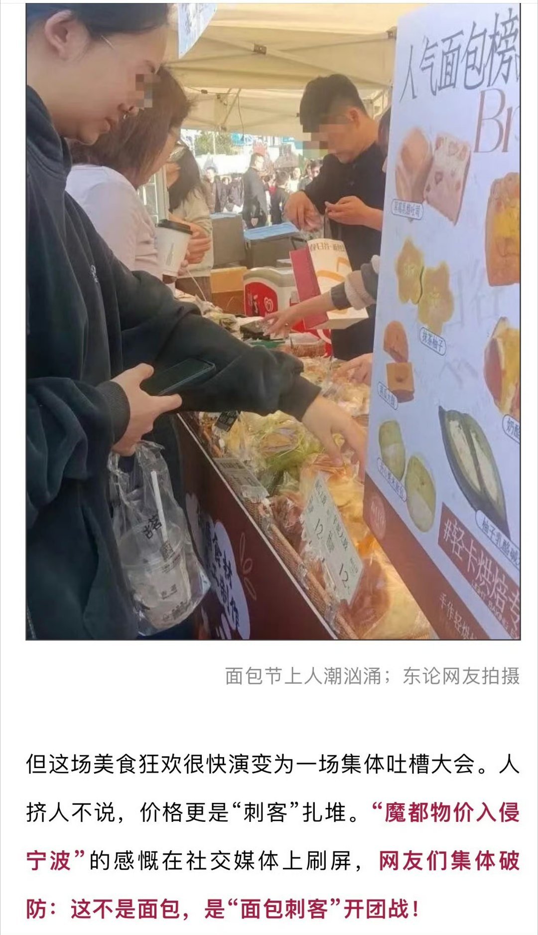 宁波这场美食狂欢被吐槽面包刺客开团战 你平常喜欢买面包吃吗?宁波有哪些好吃实惠的面包店?上周末宁波最热闹的地方应该就是天一广场了,一个面包节吸引了大批面包脑袋前往,很多人都买了面包。可是有网友发帖吐槽到:人挤人不说,价格更是“刺客”扎堆。“魔都物价入侵宁波”的感慨在社交媒体上刷屏,网友们集体破防:这不是面包,是“面包刺客”开团战!来源:东方热线