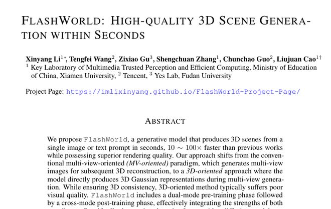 A:FlashWorld是由厦门大学、腾讯和复旦大学联合开发的一个AI模型,可以在几秒钟内从一张图片或文字描述生成精美的3D场景。它比现有的方法快10到100倍,同时保持更高的图像质量。