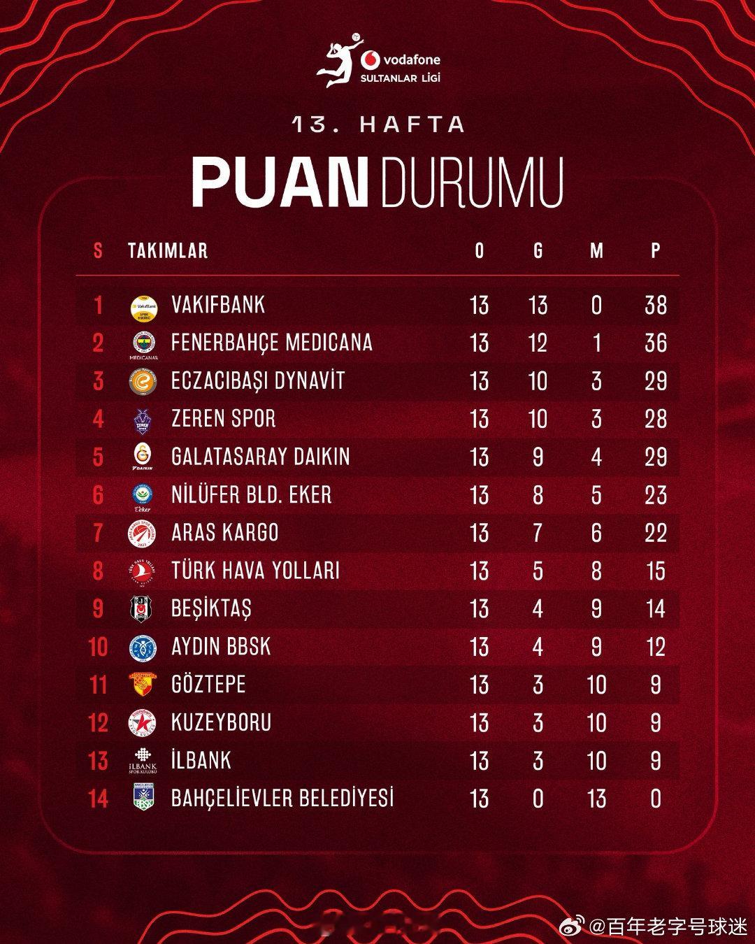 2025-2026 常规赛第13轮比赛结果和赛后的积分排名。 cr:今日排球