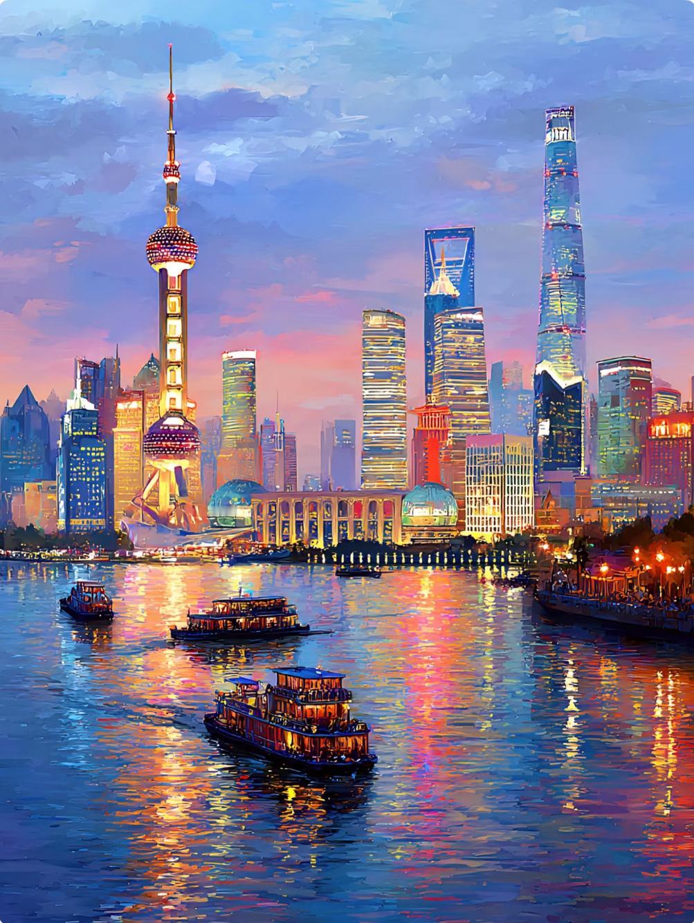 上海是中国🇨🇳的风水宝地。 外滩黄浦江的水 就是这座城市的一一大动脉。 所以风水宝地从不靠山水定格, 而在每滴江水都敢同时承载: 摆渡苦难的乌篷、 运送繁华的巨轮, 与丈量天际线的光的倒影。 上海之大幸, 是它的动脉里永远 流淌着未完成的浪涛。