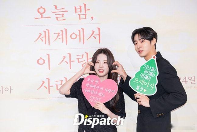 22日,电影《今夜即便这份恋情从世界消散》举行媒体试映会,主演秋英宇申诗雅出席。